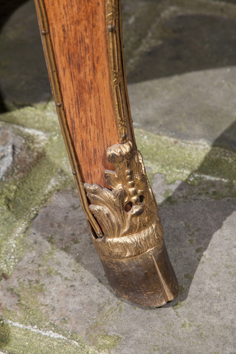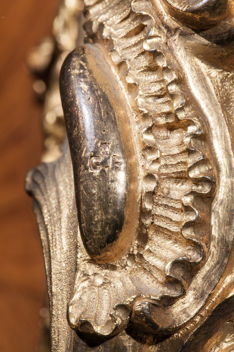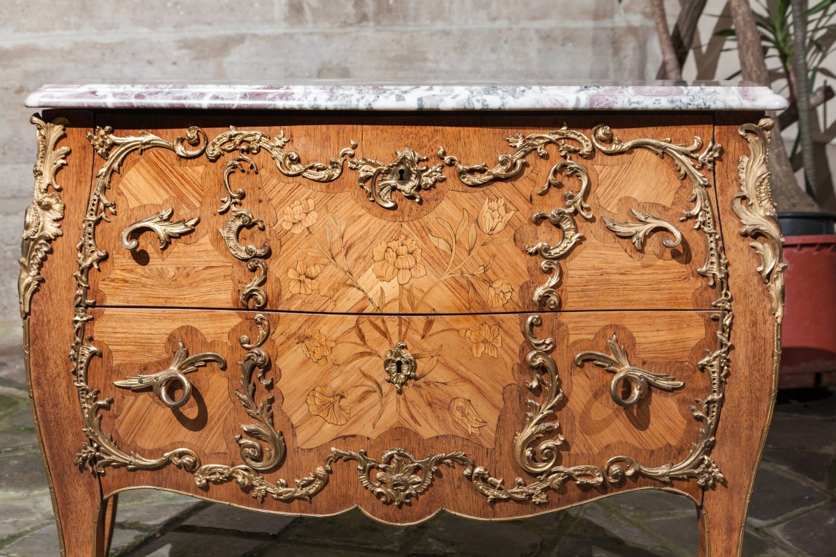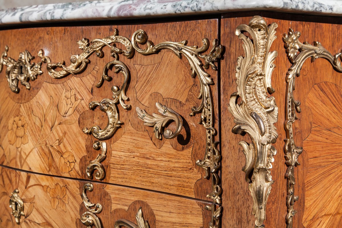PAIRE de COMMODES à façades et côtés galbés en placage de bois de rose dans des encadrements mouvementés de bois de violette à décor marqueté de branches fleuries dans des réserves. Elles ouvrent à deux tiroirs sans traverse. Riche ornementation de bronzes rocaille ciselés dorés, marqués CP. Dessus de marbre fleur de pêcher.
