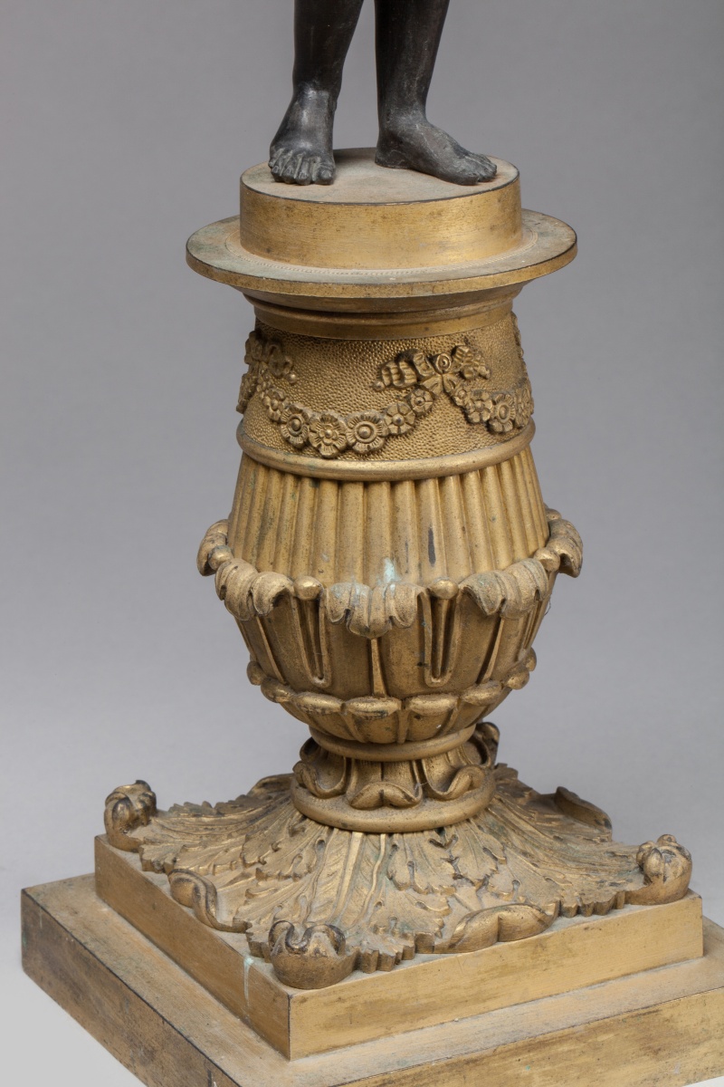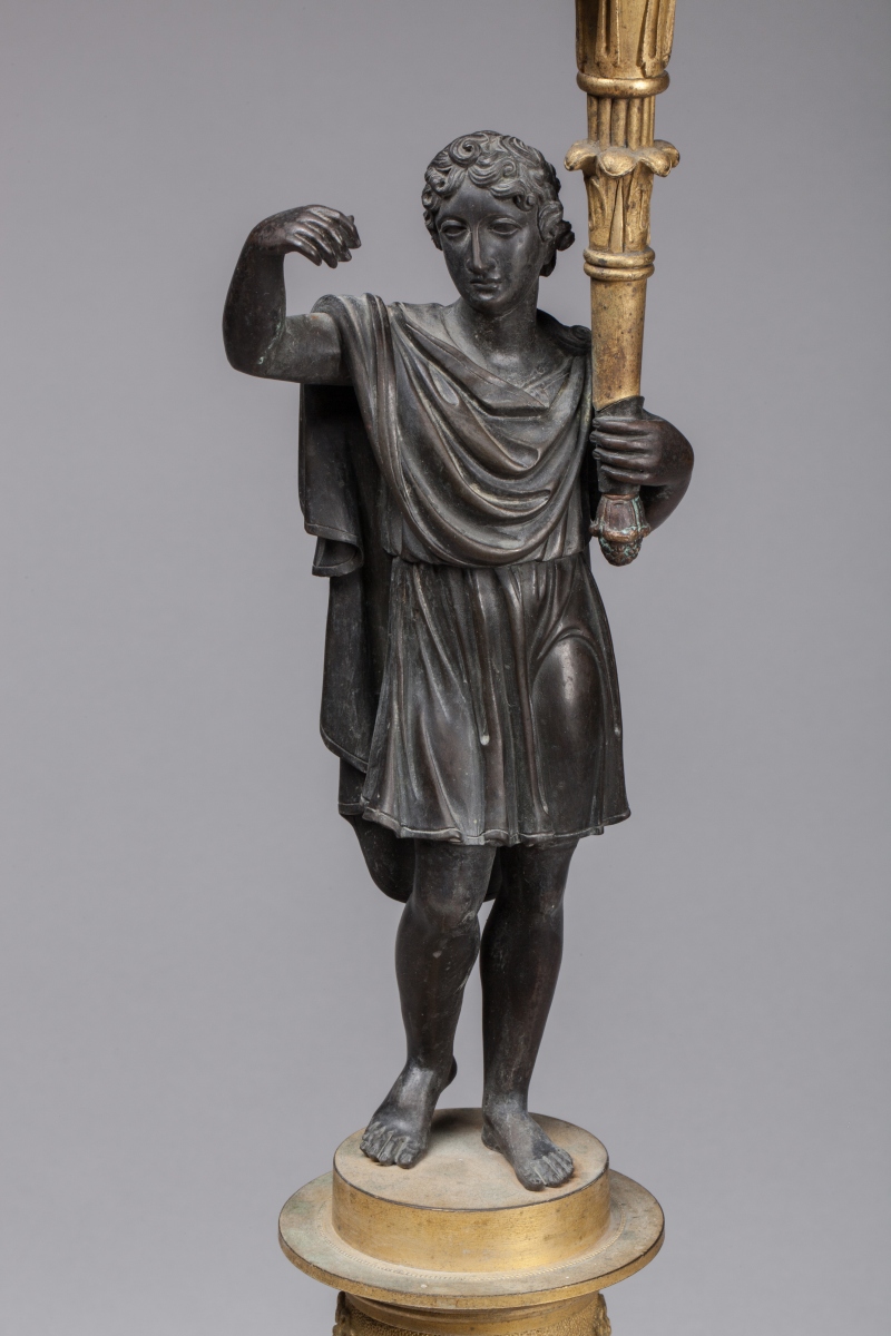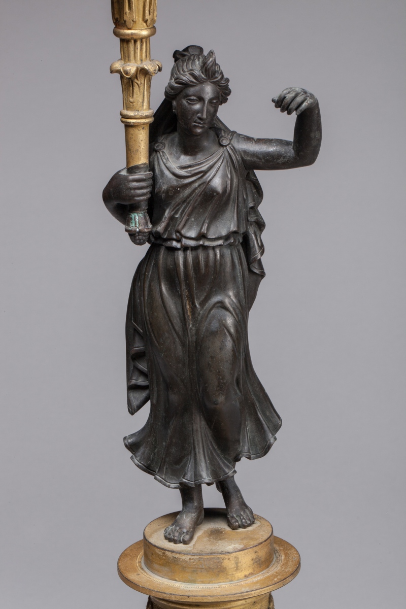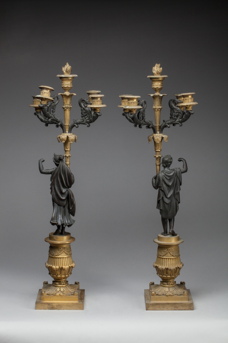 PAIRE de CANDÉLABRES à cinq lumières en bronze doré et bronze patiné. Le fût figurant une femme, pour l'un, et un homme, pour l'autre, vêtus à l'antique tenant de leur main droite une hampe feuillagée d'où s'échappent les bras de lumière. Ces derniers adoptent la forme de rinceaux feuillagés terminés par un col de cygne. Le binet central formant pot à feu. Socle piriforme à décor de guirlandes de fleurs, godrons et larges feuilles d'acanthe. L'ensemble repose sur une base carrée.
