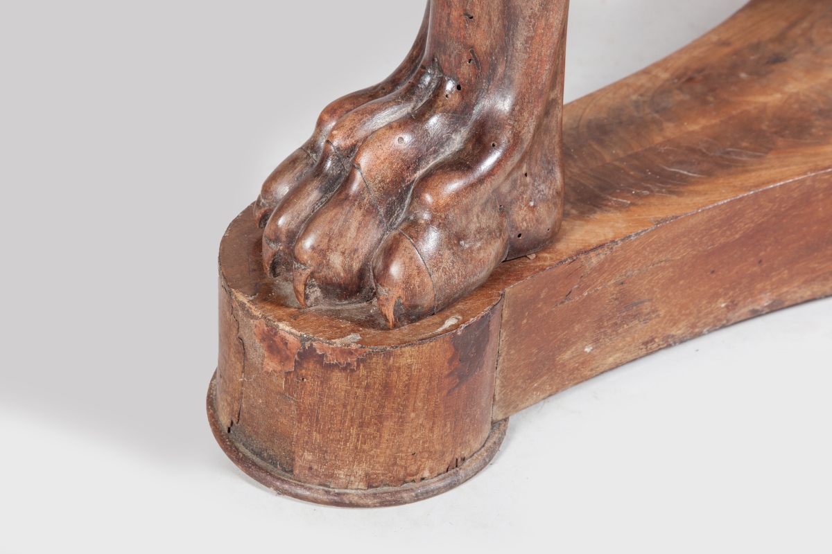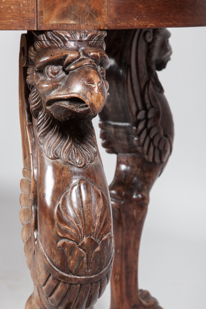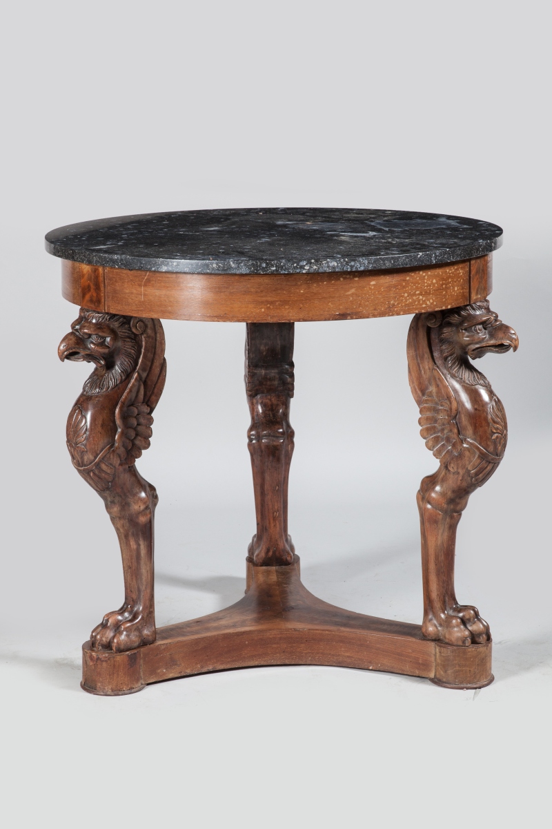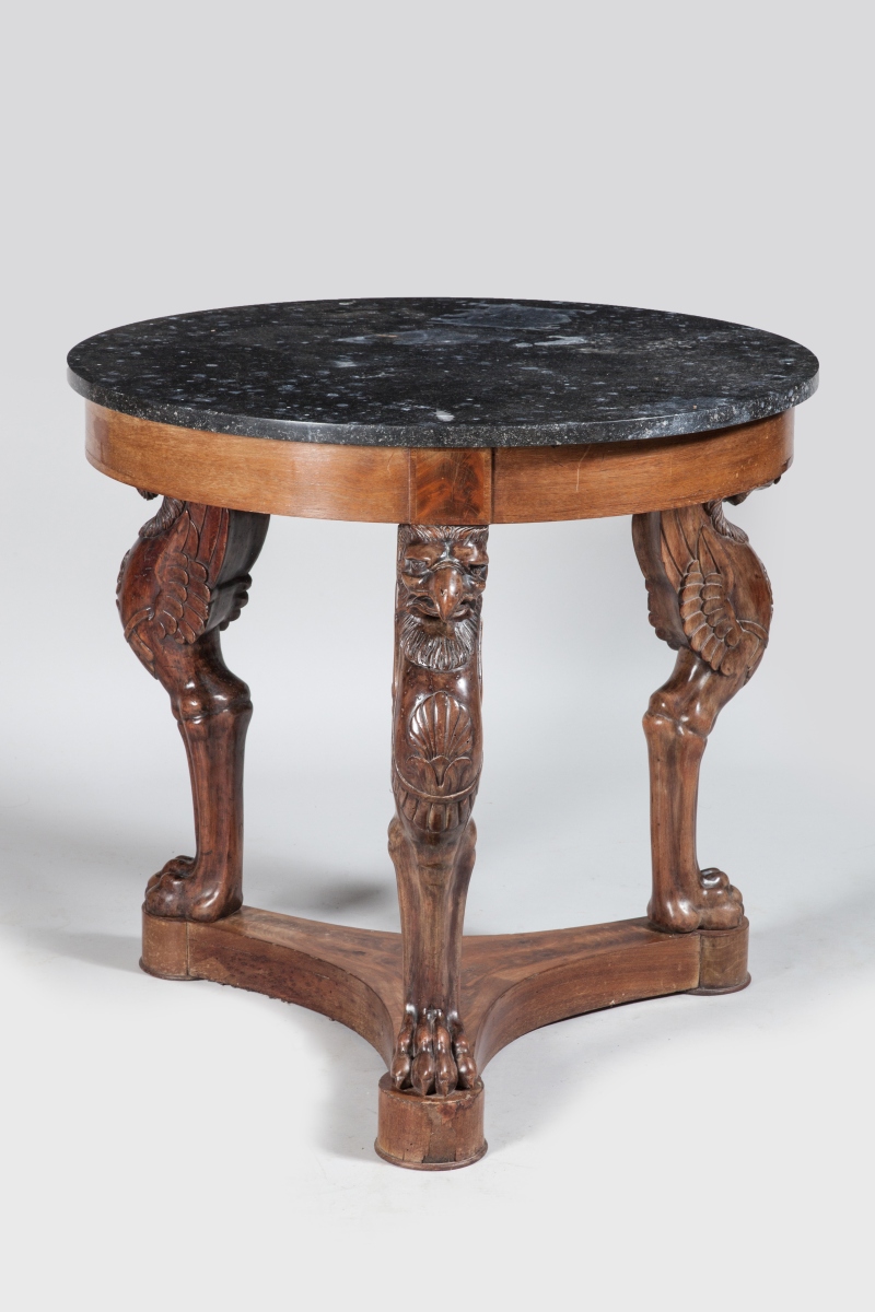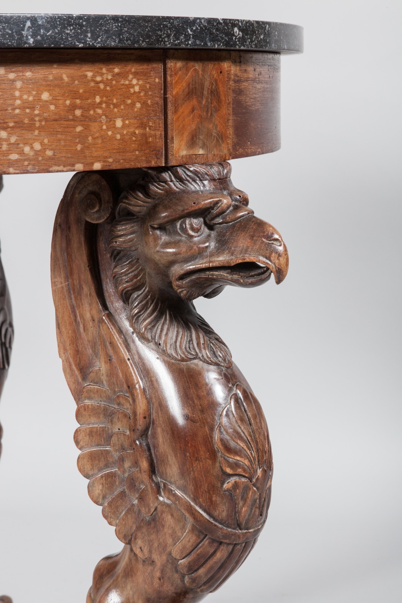 de forme ronde en acajou et placage d'acajou. Il repose sur trois pieds griffes monopode à buste de griffon réunis pas une entretoise. Plateau de marbre noir.