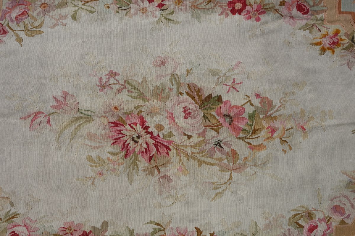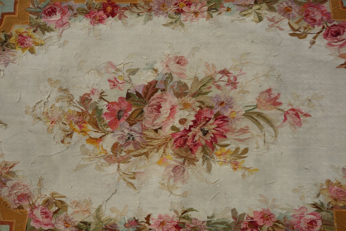 TAPIS d'AUBUSSON en laine à fond bordeaux, guirlande fleuries de roses.