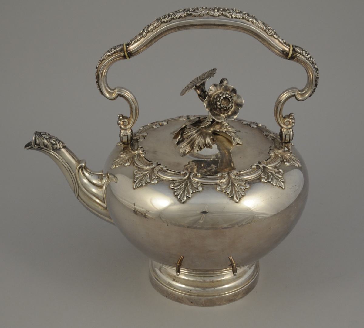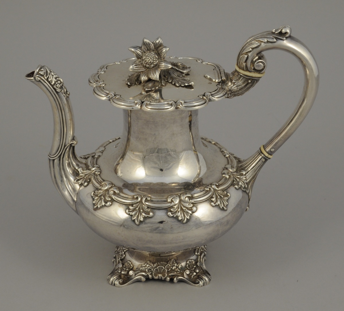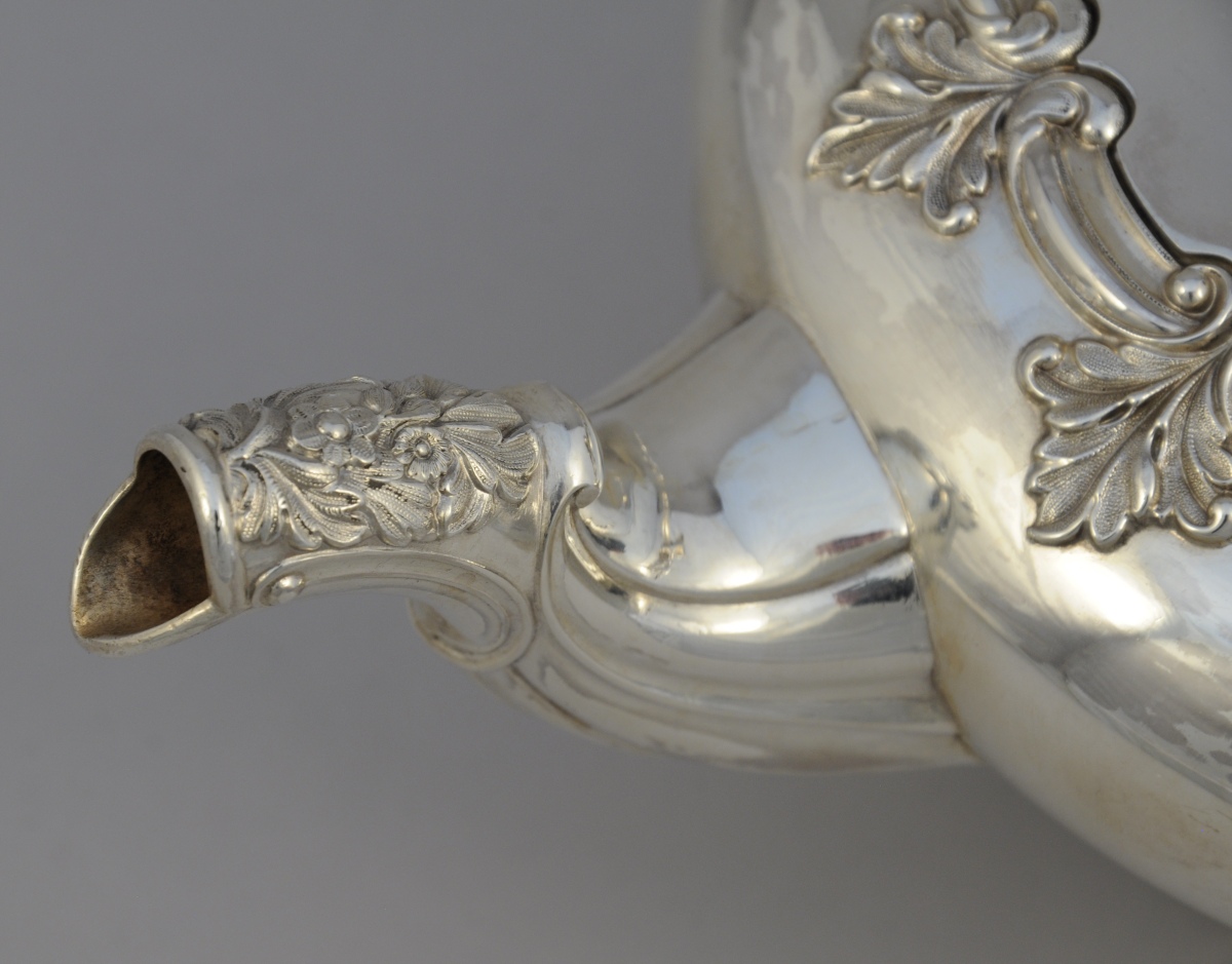 Décor de frises d'agrafes alternées de feuilles d'acanthe et motifs floraux. Il se compose d'un samovar et de son réchaud, d'une théière, d'une cafetière, d'un sucrier et d'un pot-à-lait. Le samovar à anse en accolade baguée d'ivoire, le bec-verseur godronné. Le fretel figurant deux fleurs épanouies et un bouton sur une terrasse feuillagée. Support reposant sur piètement quadripode à pattes de canard. Les autres pièces à anse volute baguée d'ivoire. Le sucrier à anses latérales à attaches feuillagées. Reposent sur un piètement à quatre pieds à enroulements.