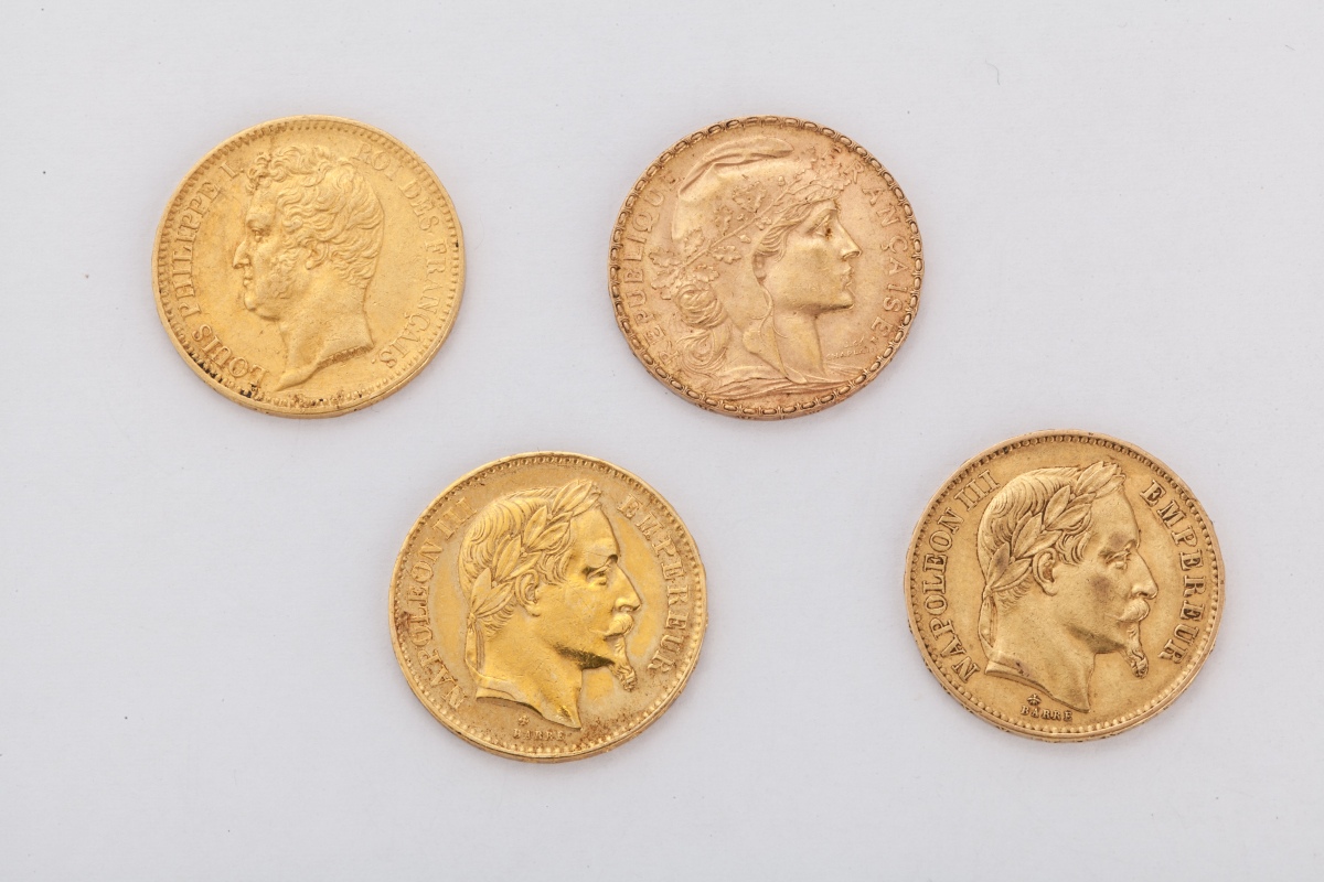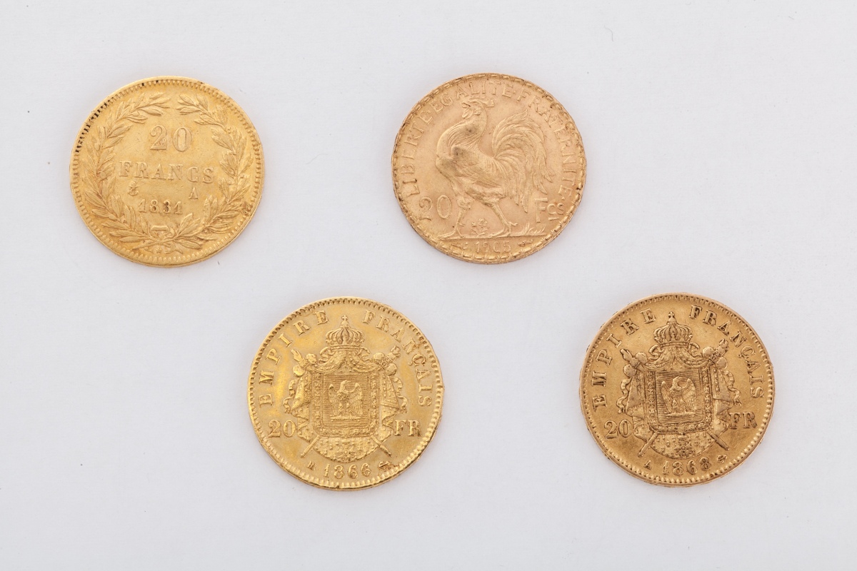 FRANCE. 4 pièces de 20 francs or: Louis-Philippe (1831), Napoléon III lauréé (1866, 1868), Coq (1905).