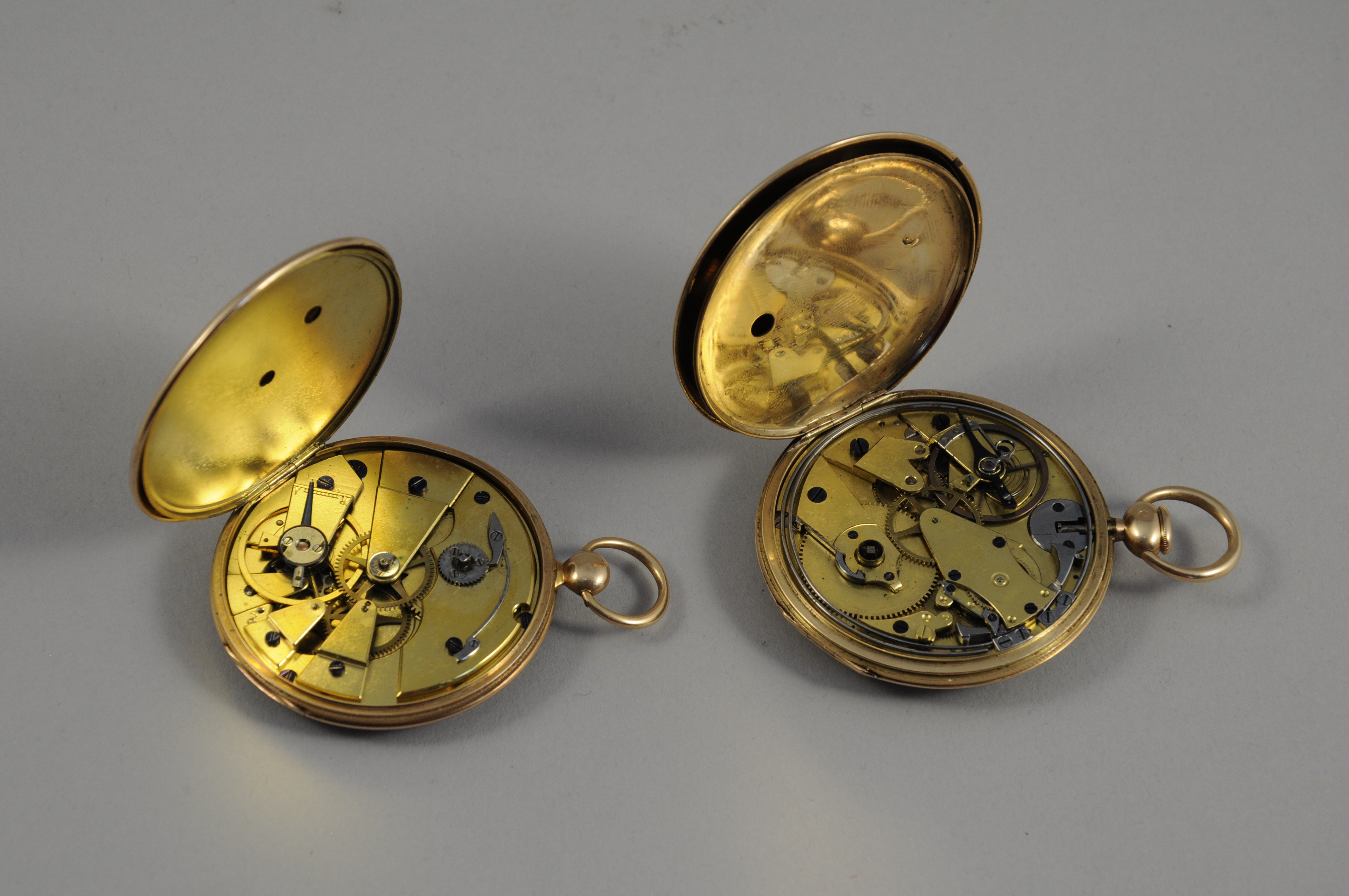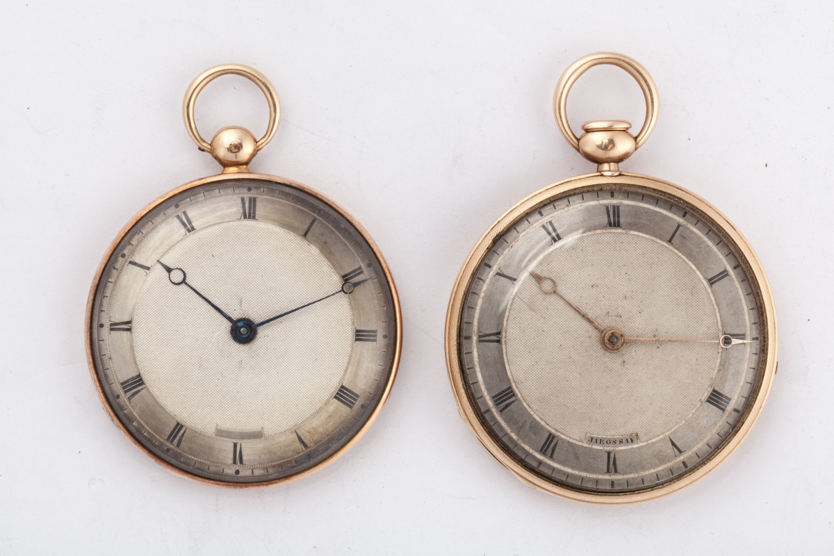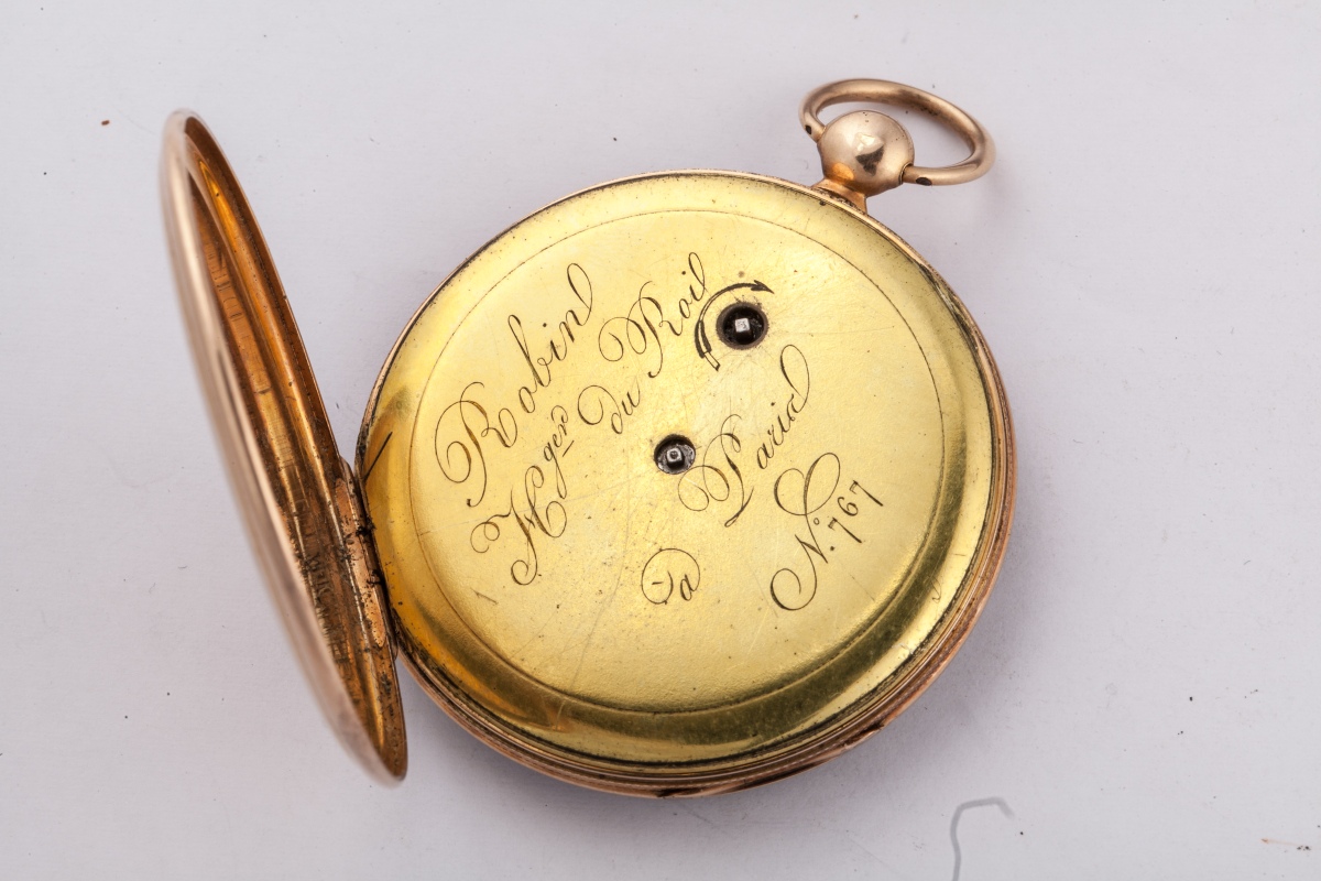 Joint: MONTRE de GOUSSET plate, en or, à clef. Le cadran, sur fond guilloché doré, indique les heures en chiffres romains. Le boîtiers finement ciselé de guillochis et centré d'un cercle. Avec son cache poussière en métal, signée "ROBIN" et numérotée "767".