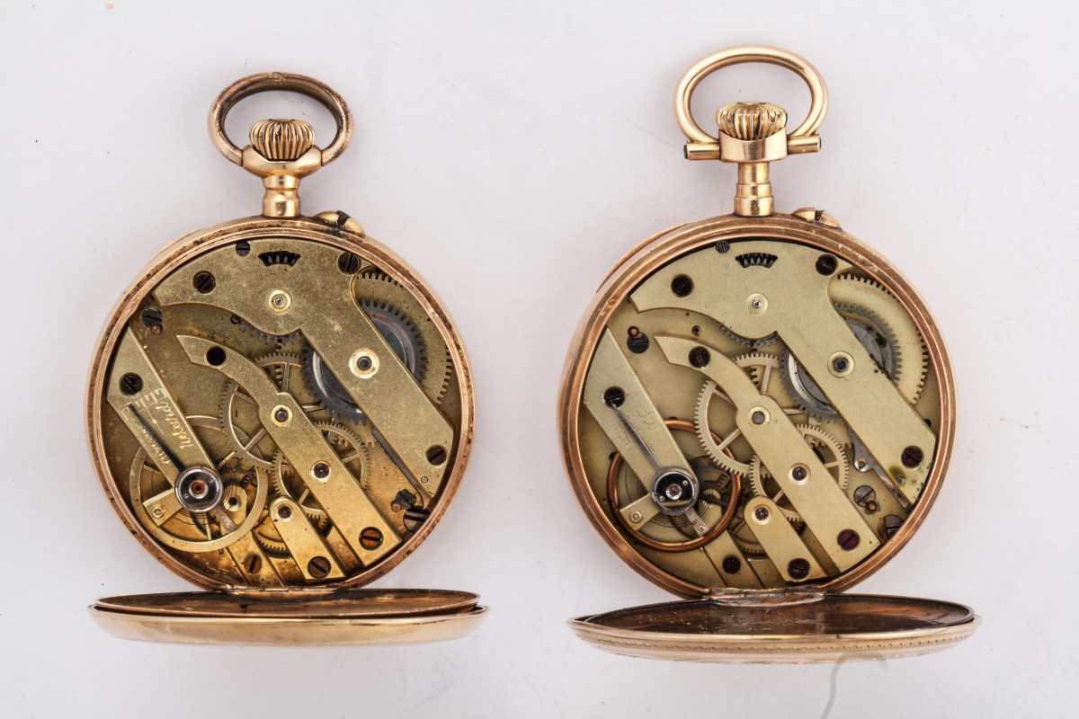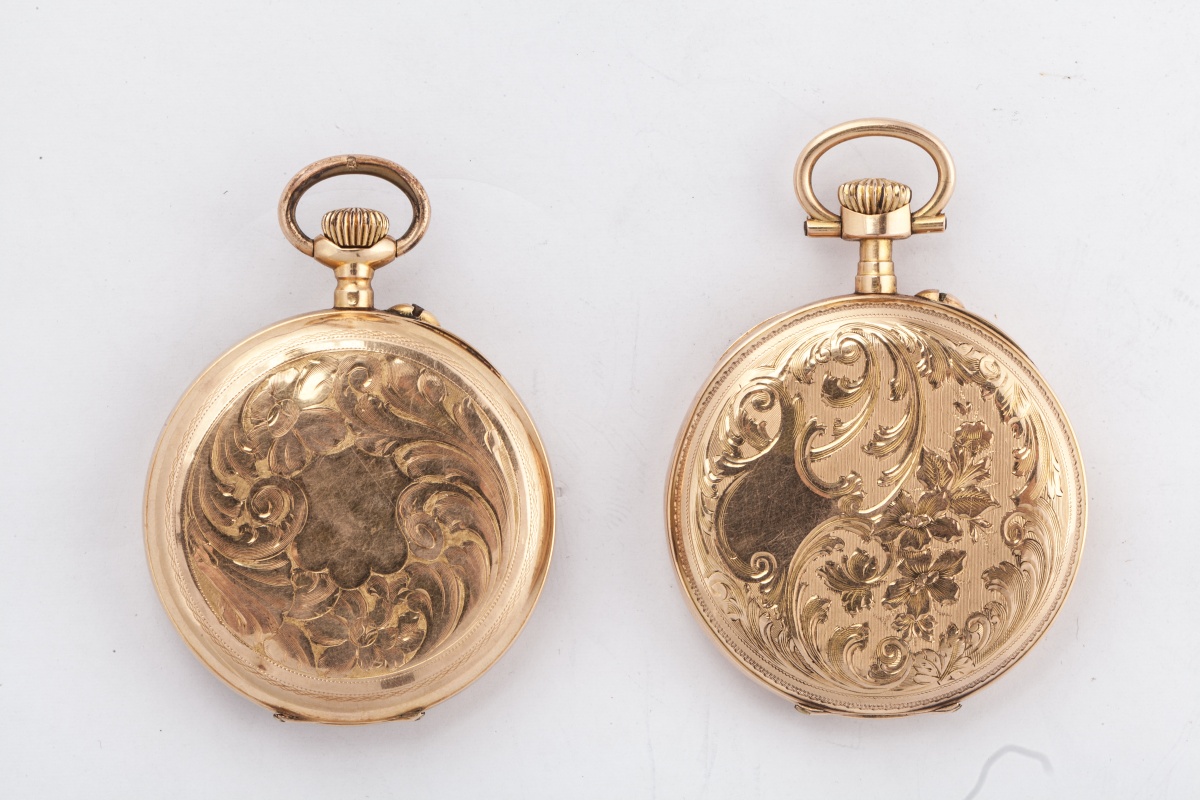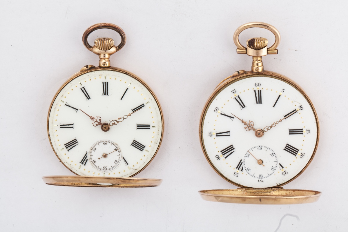 2 MONTRES de GOUSSET, à remontoir au pendant, en or, à double cadrans émaillés à fond blanc réhaussé d'or, les aiguilles sont en or ajouré.