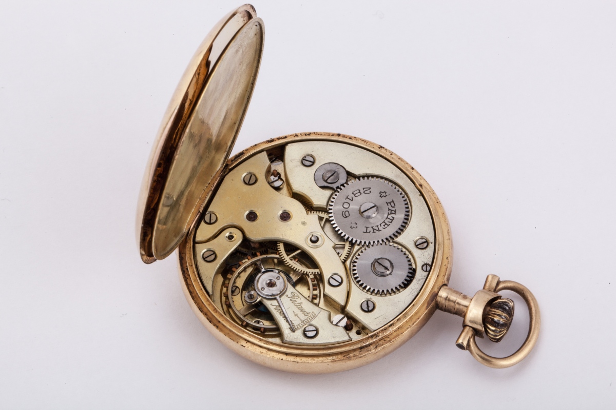 - CHRONOMETRE de gousset. Double cadran émaillé blanc, indiquant les heures du matin en chiffres romains, les heures de l'après-midi en chiffres arabes. Signée "ANCRE 17 RUBIS BALANCIER COMPENSE SPIRAL BREGUET DOUBLE PLATEAU" et numérotée "536677".