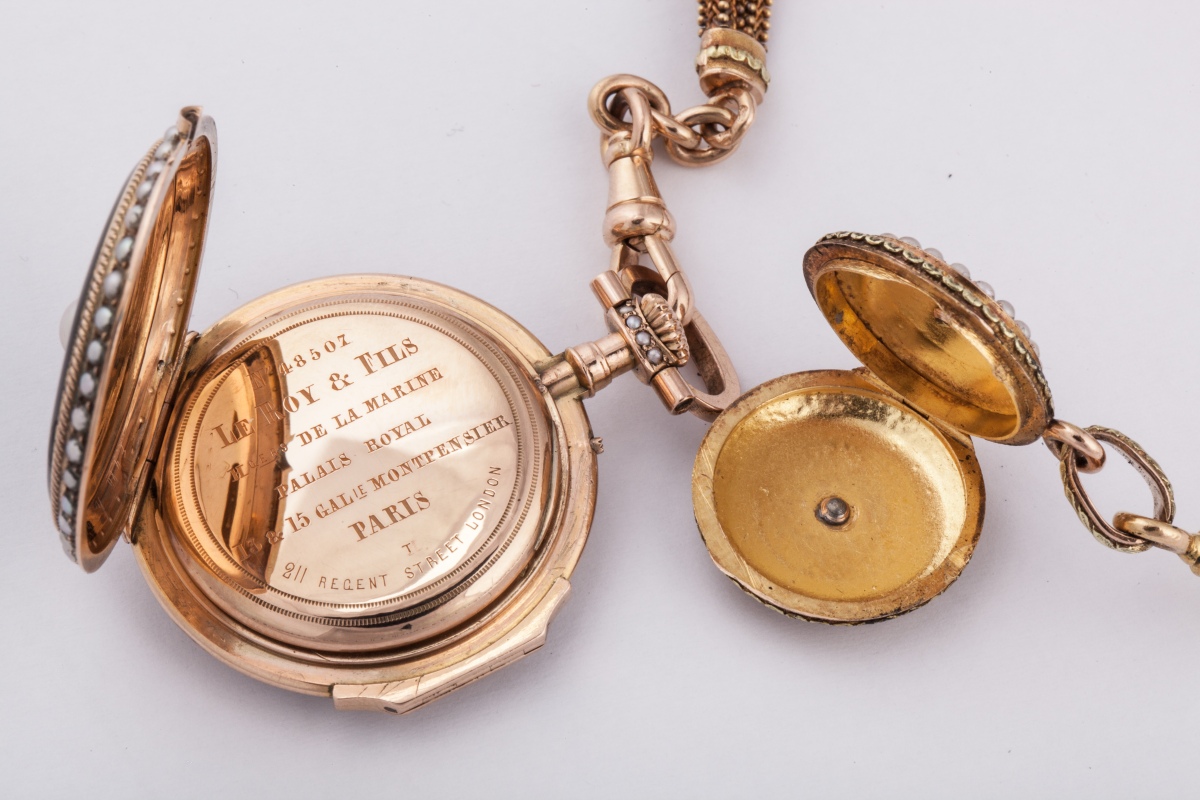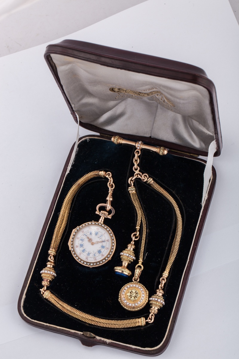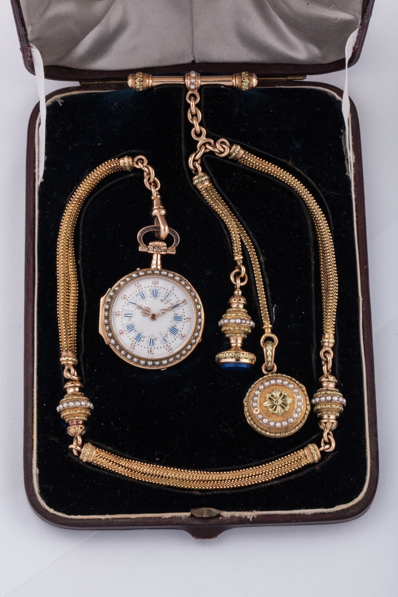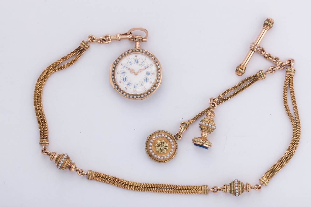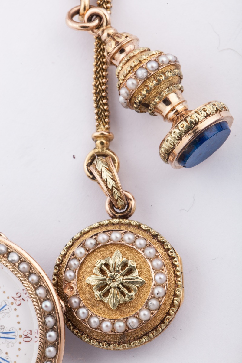 CHATELAINE en or jaune ornée de perles. La barette d'accrochage supporte trois chaînettes. L'une retient une MONTRE en or, le cadran émaillé blanc indiquant les heures en chiffres romains et les minutes en chiffres arabes. Le dos du boîtier émaillé noir et serti de perles. La deuxième un pendentif reliquaire en or centré d'un fleuron et la troisième un cachet vierge en lapiz-lazuli. Ces éléments tous sertis de perles. La montre numérotée 48507. Dans son écrin.