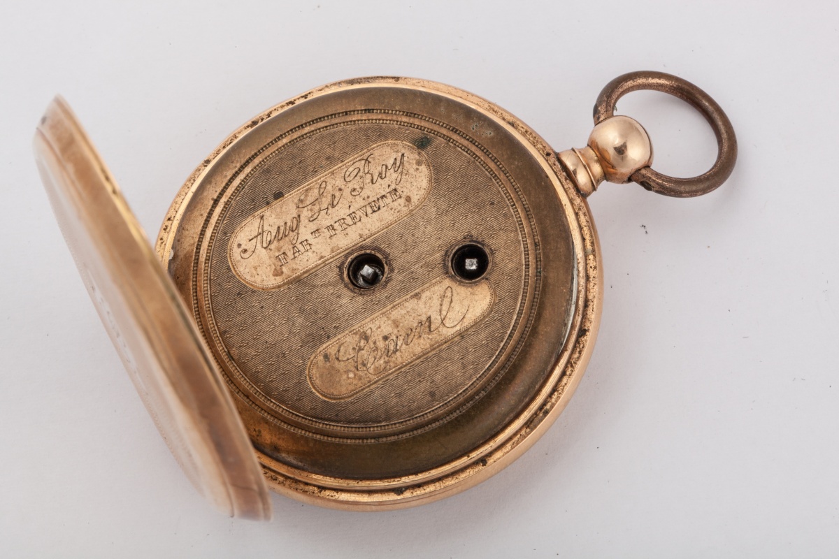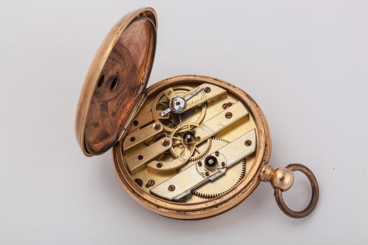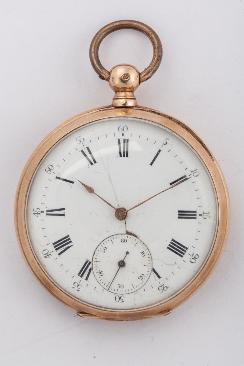 MONTRE DE GOUSSET à clef en or. Le cadran émaillé blanc indiquant les heures en chiffres romains et les minutes en chiffres arabes. le dos du boîtier guilloché et monogrammé "LR" dans un cartouche. Le cache-poussière en métal doré signé "Aug. Le Roy / Caen". Avec son remontoir.