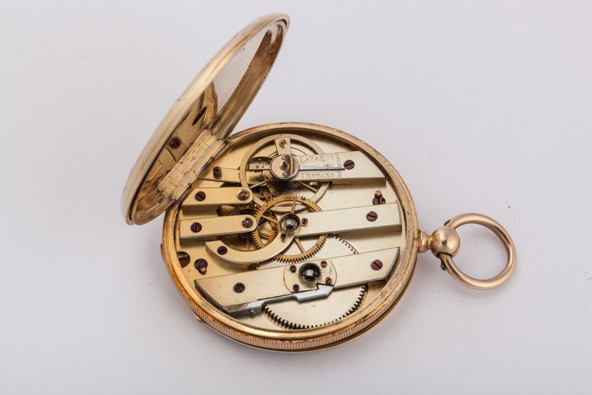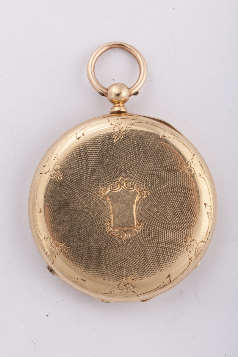 MONTRE de GOUSSET en or, à clef. Le cadran émaillé blanc, indique les heures en chiffres romains. Le boîtier est centré d'un écu agrémenté de fleur de lys, palmettes, et volutes. Le pourtour est orné d'une frise feuillagée et pontuée de fleurs, sur fond guilloché. Signée "C. DETOUCHE. Feur DE S.M. L'EMPEREUR"" et numérotée "264" et "42966".