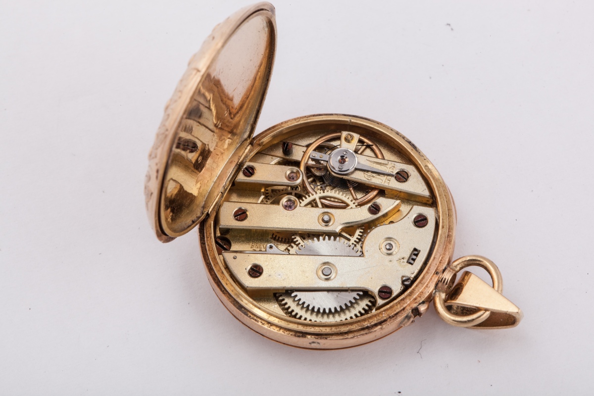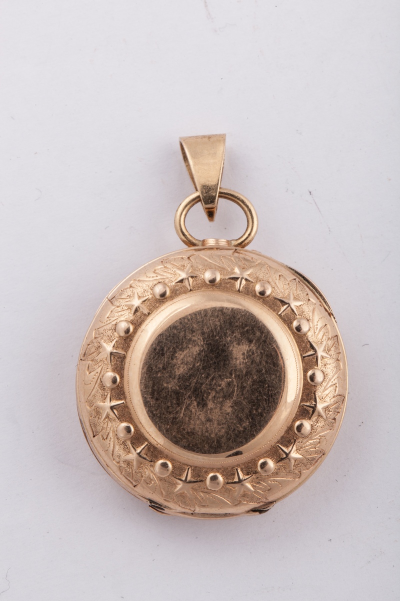 MONTRE DE COL, en or. Le cadran émaillé blanc avec réhauts, indique les heures en chiffres romains. Le boîtier est cerclé de deux frises d'étoiles et ronds sur fond de fleuillages. Bélière.