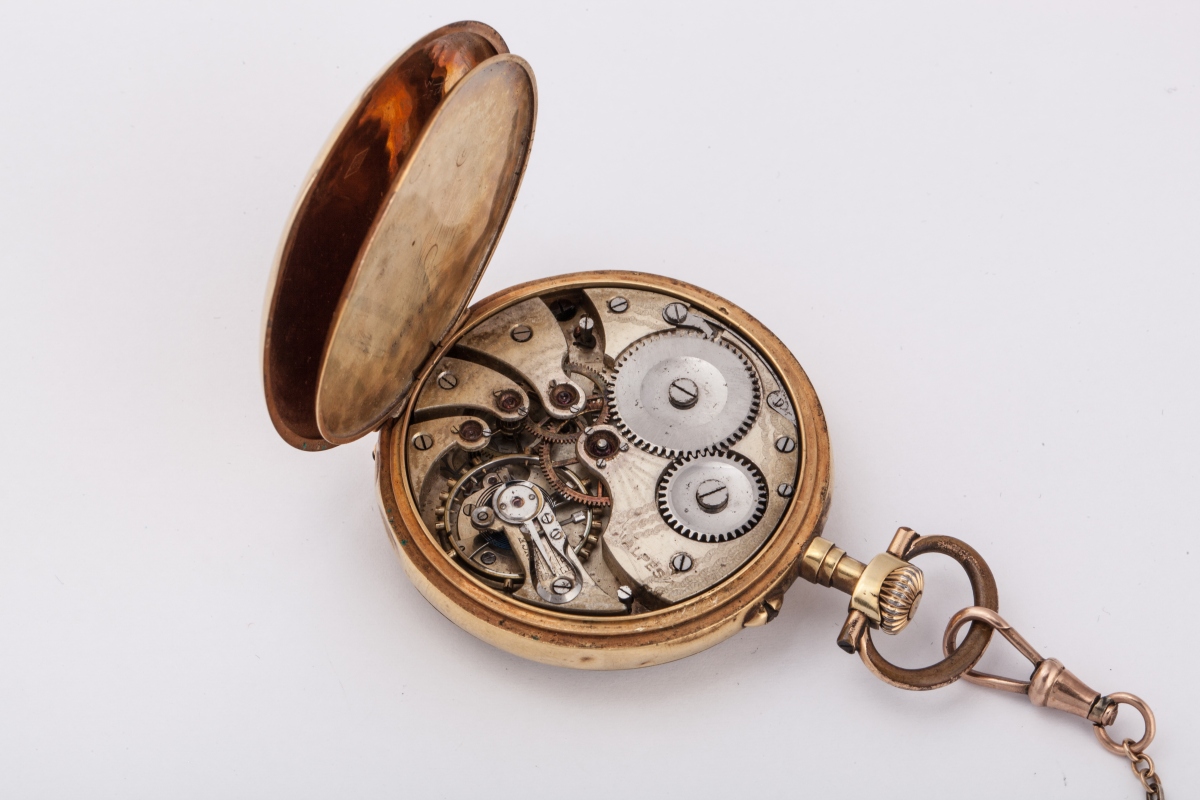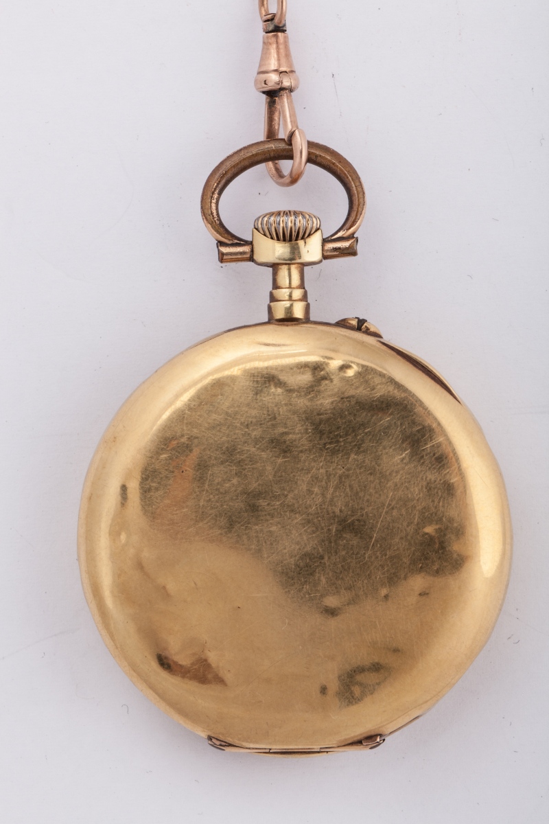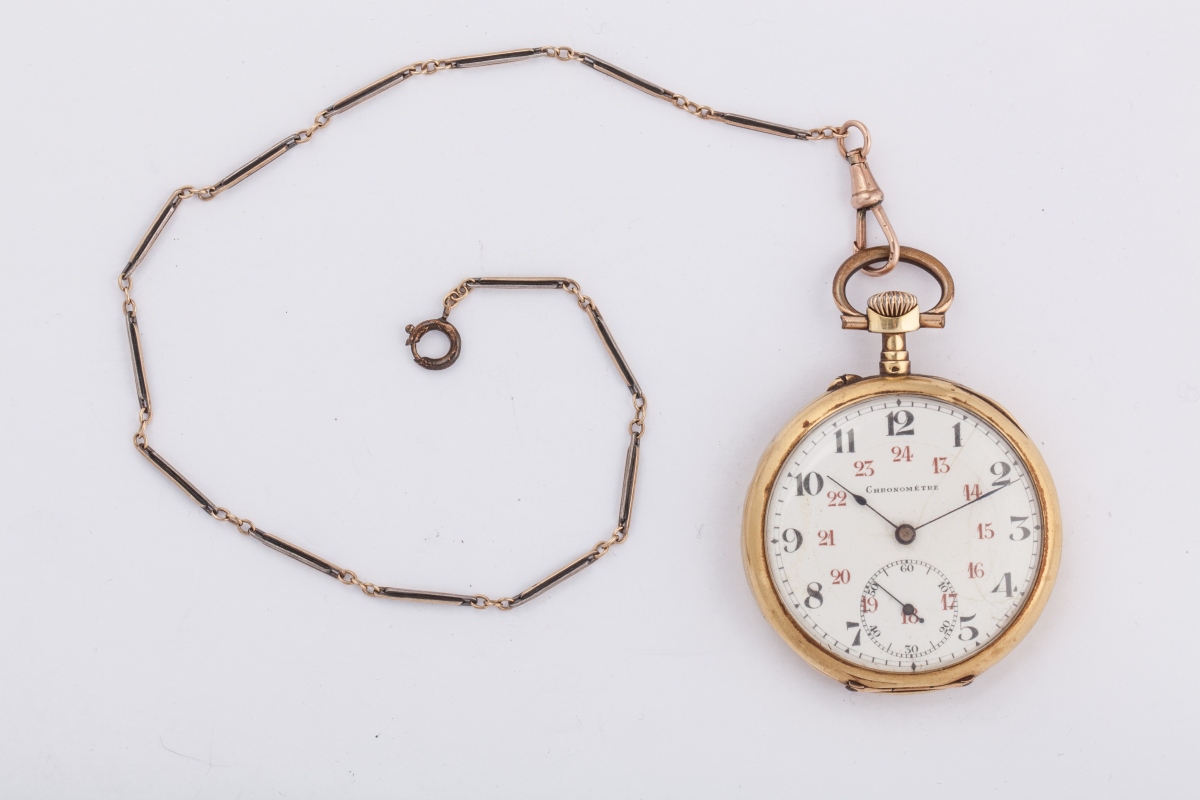 CHRONOMÈTRE de poche en or, cadran émaillé de chiffres arabes....