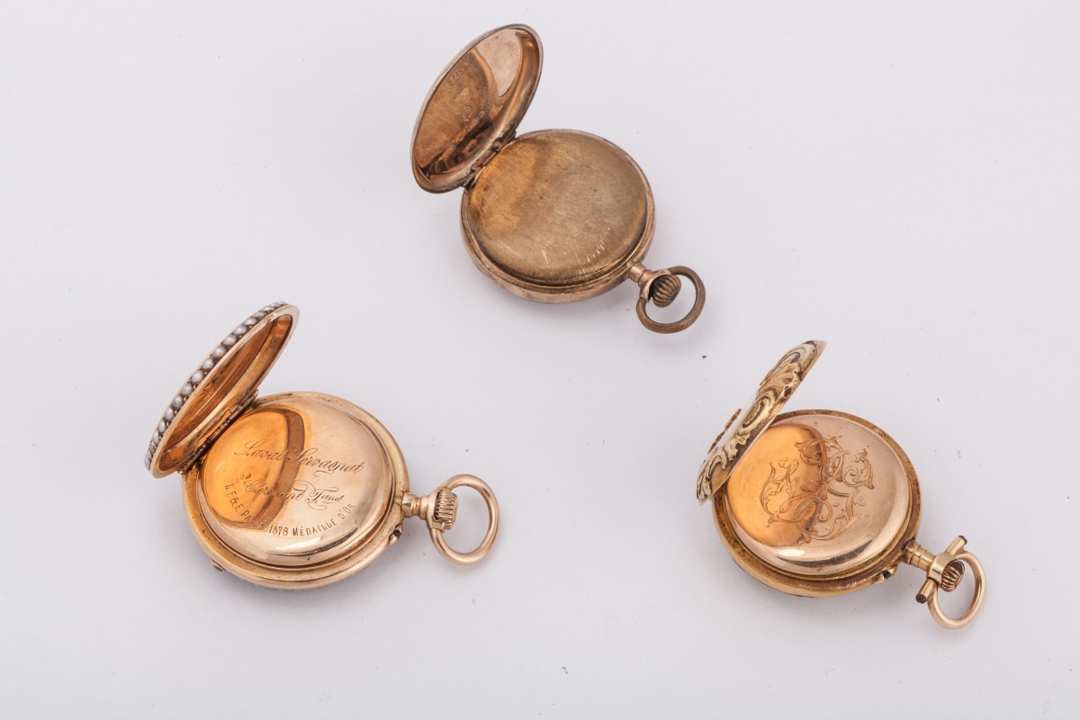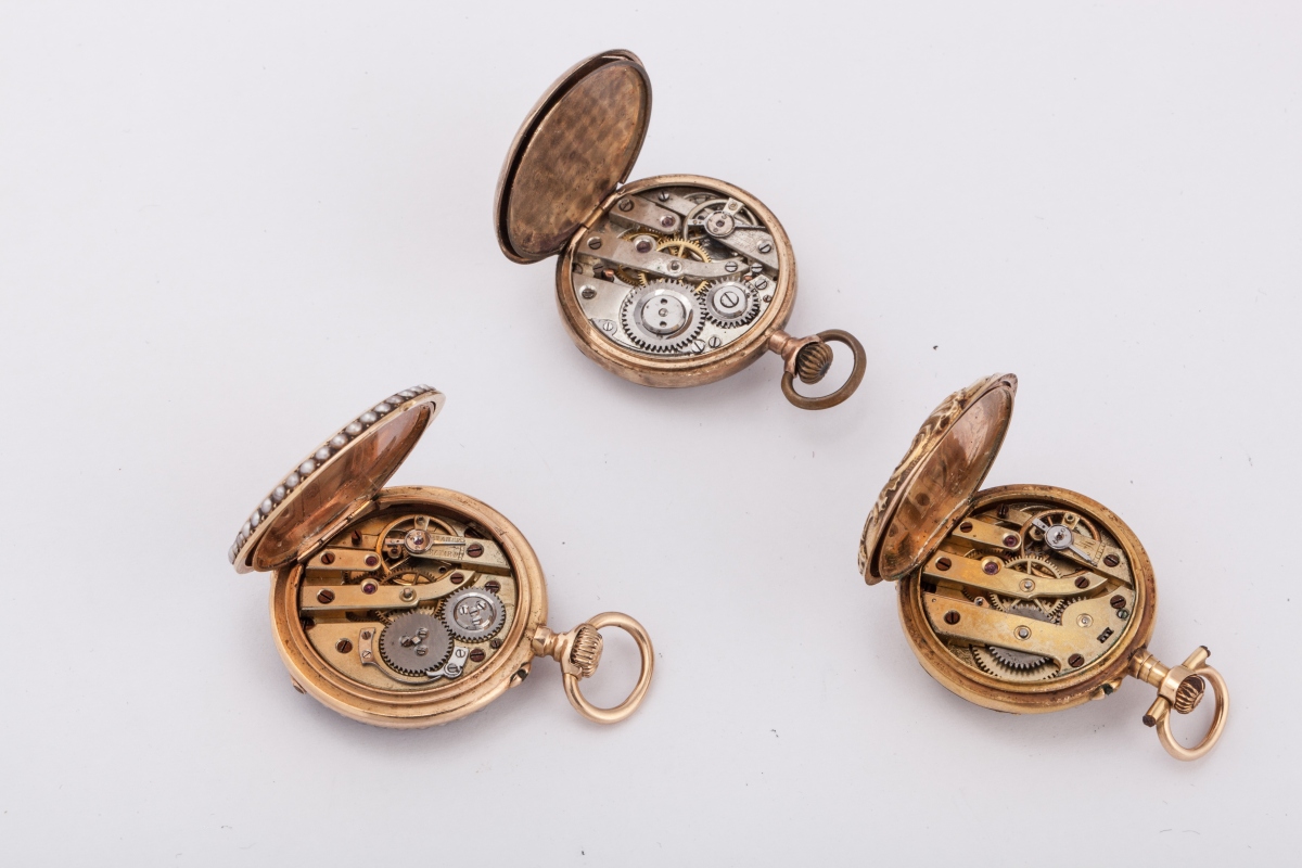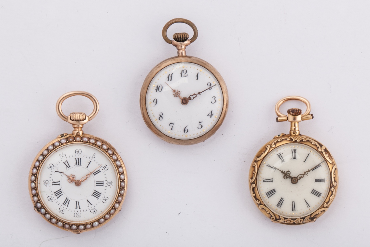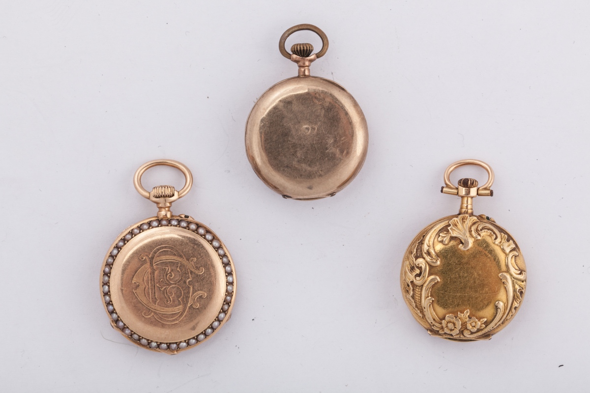3 MONTRES de COL en or, à remontoir au pendant. Les cadrans émaillés à fond blanc.