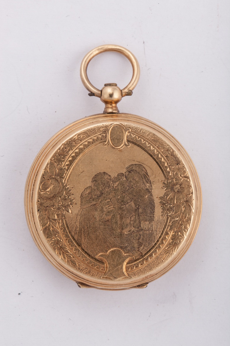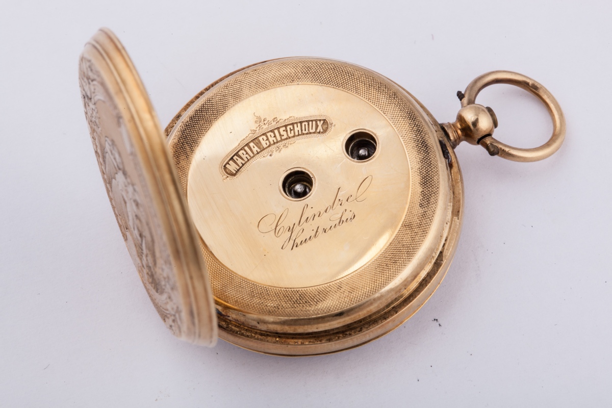 MONTRE de COL en or, à clef. Le cadran émaillé à fond blanc, indiquant les heures en chiffres romains et les minutes en chiffres arabes. Le boîtier ciselé figurant une Vierge à l'Enfant d'après Raphaël, dans un encadrement d'une frise raie-de-coeur alternée d'écus et bordé de motifs végétaux sur fond guilloché. Signée "MARIA BRISCHOUX" et numérotée "41203".