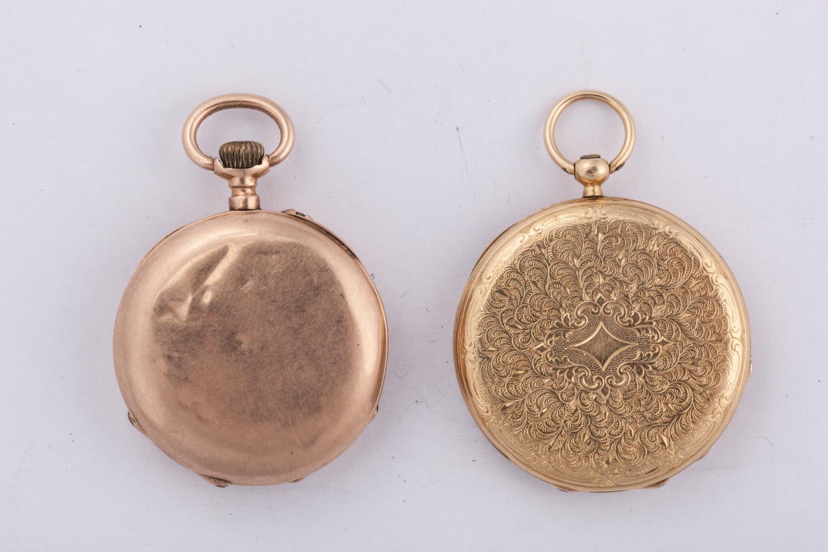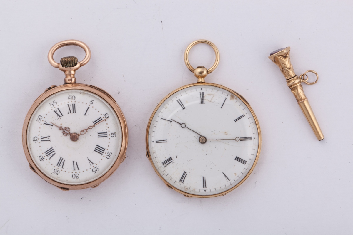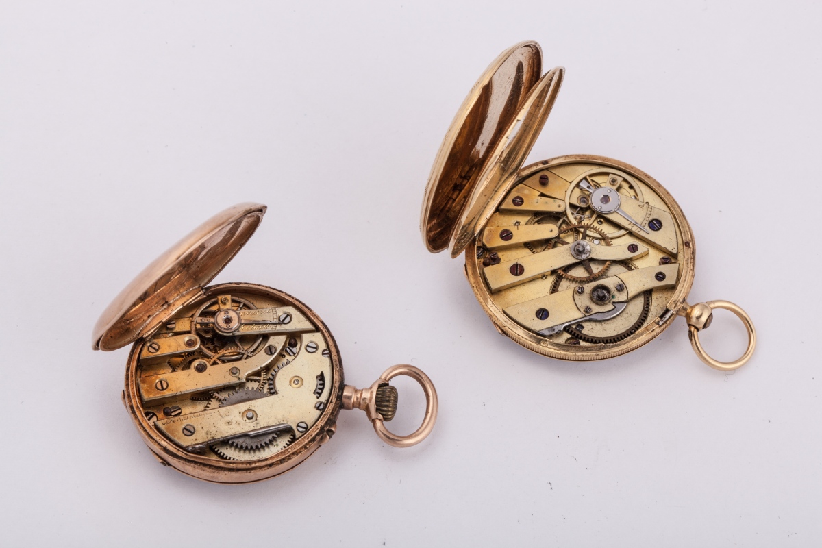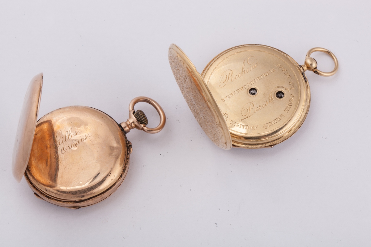 2 MONTRES de COL en or, à remontoir au pendant ou à clef. Les cadrans émaillés sur fond blanc.