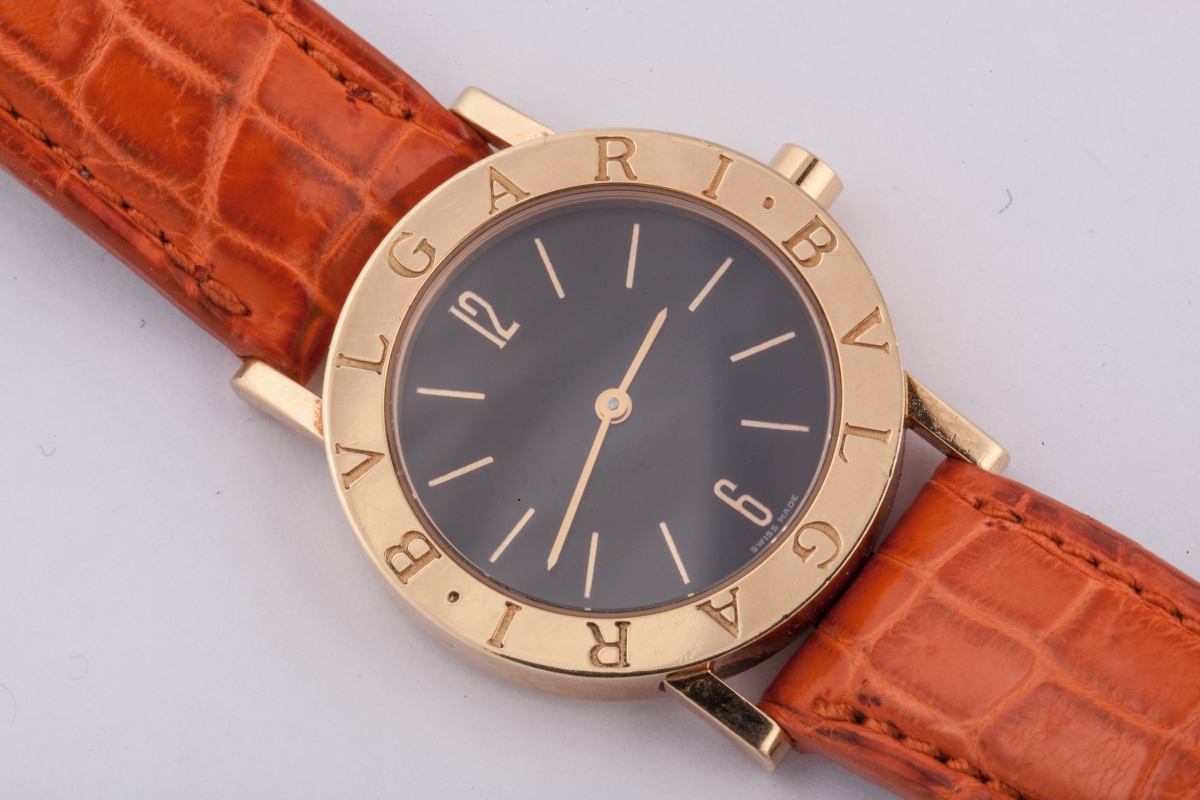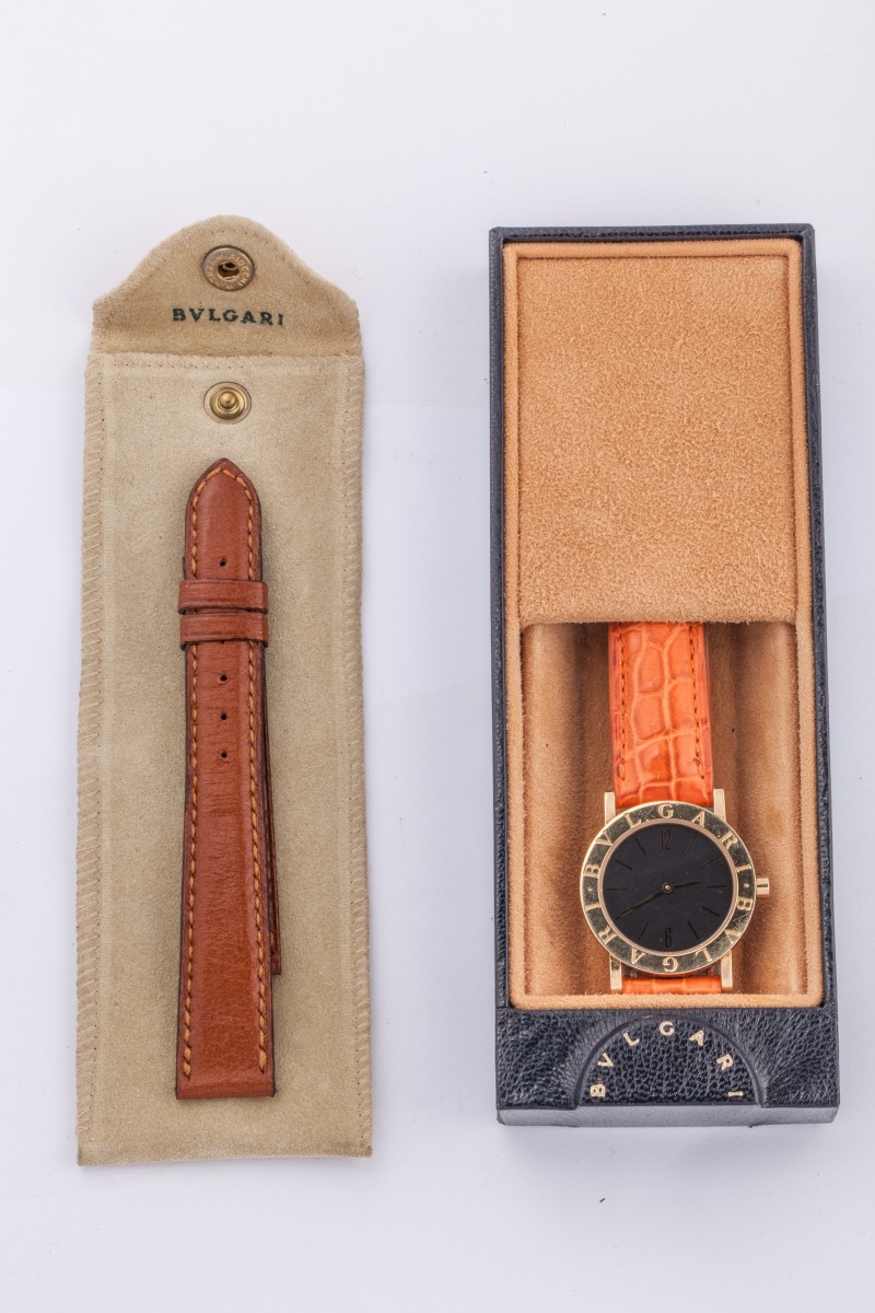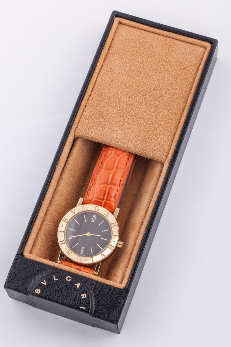 BULGARI. MONTRE-BRACELET d'homme, modèle "BB", en or jaune. Le cadran à fond noir. Bracelet en crocodile orange.