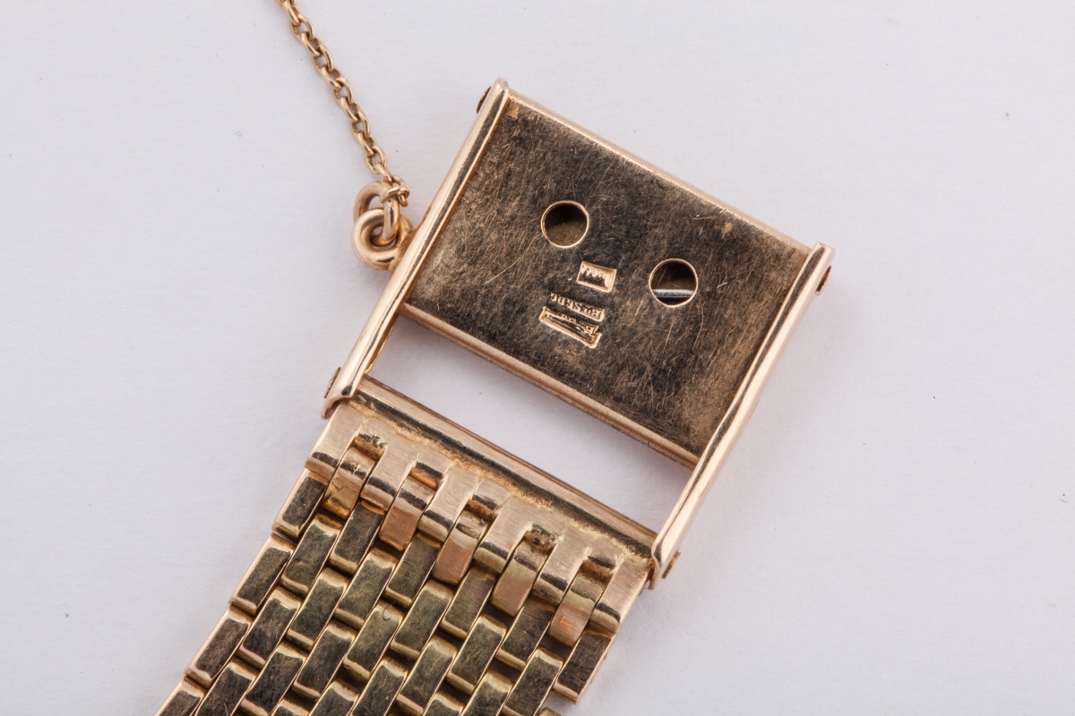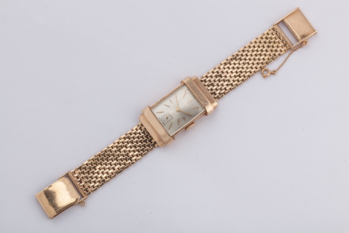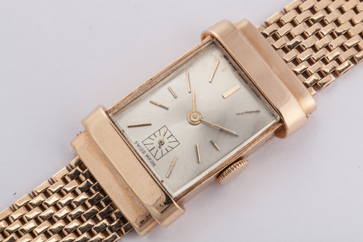 MONTRE BRACELET en or jaune. Le double cadran de forme rectangulaire à fond nacré. Bracelet souple constitué de mailles d'or articulées. Travail suisse.