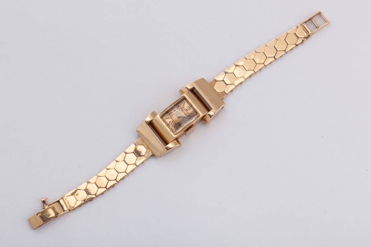DALIBON. MONTRE BRACELET de dame en or. Le bracelet à maille serpent. Le cadran est de forme rectangulaire et indique les heures en chiffres arabes. Signé "DALIBON" sur le cadran.