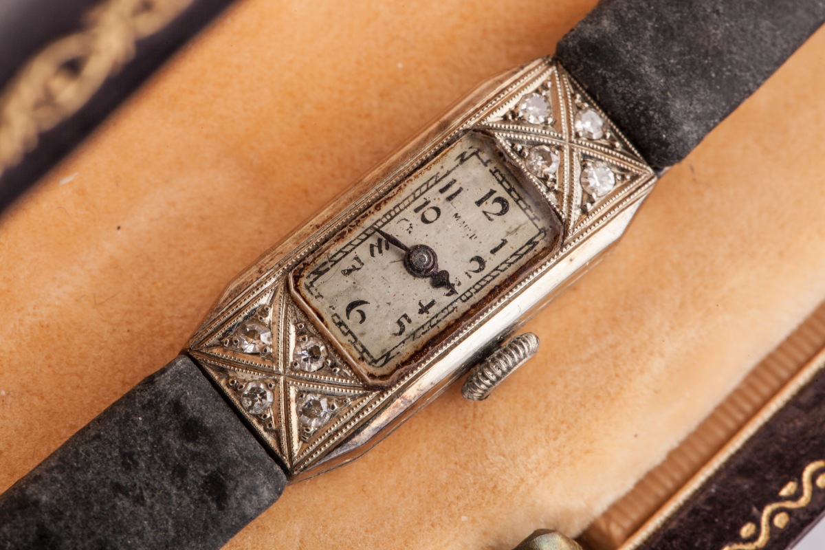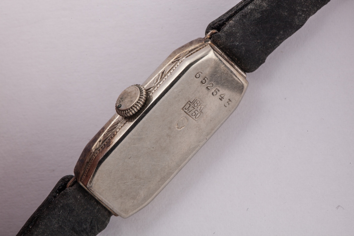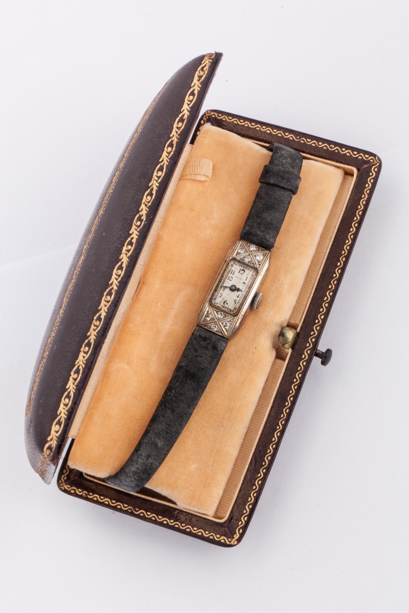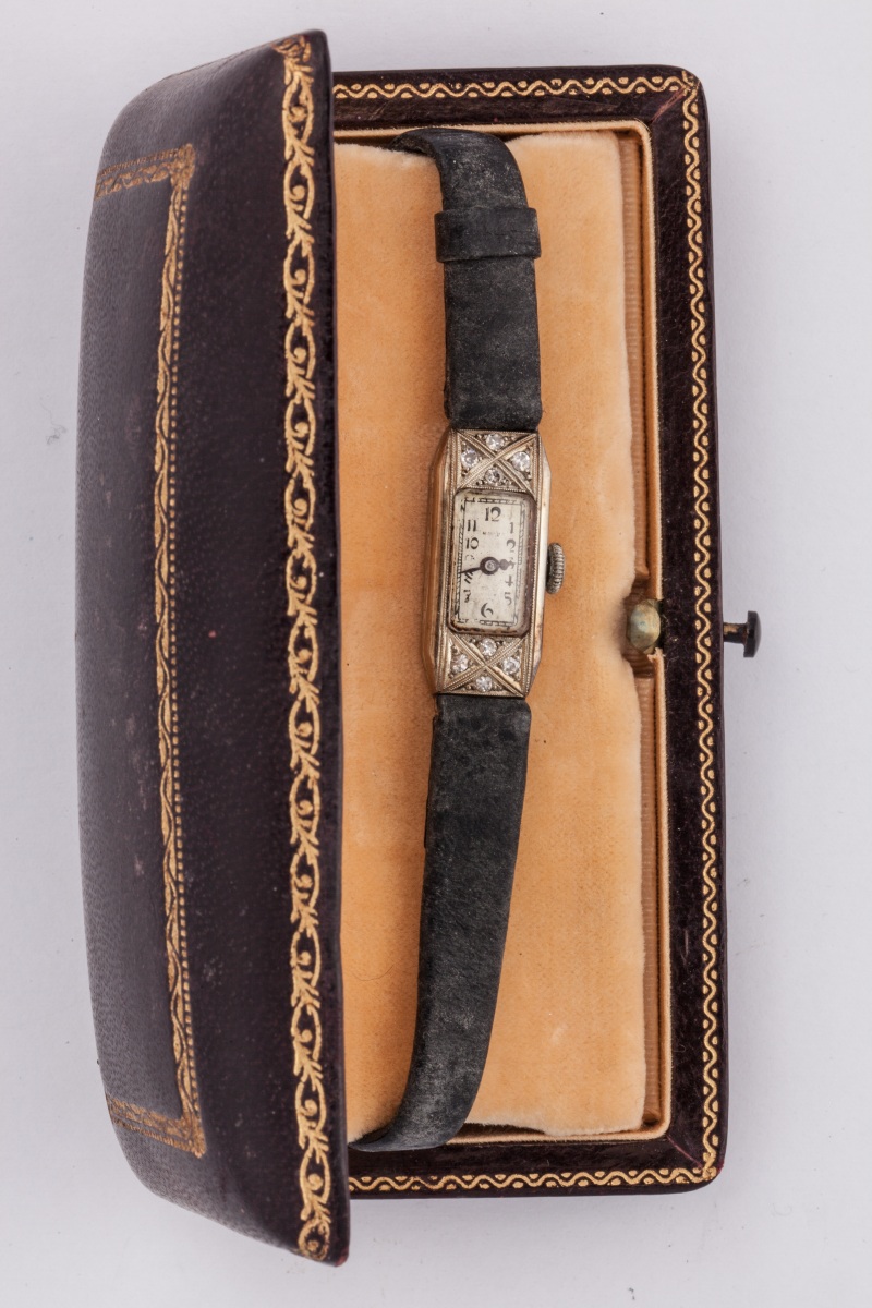 MONTRE-BRACELET de dame en argent. Le boîtier de forme rectangulaire orné de huit brillants. Cadran indiquant les heures en chiffres arabes. Bracelet en cuir noir.