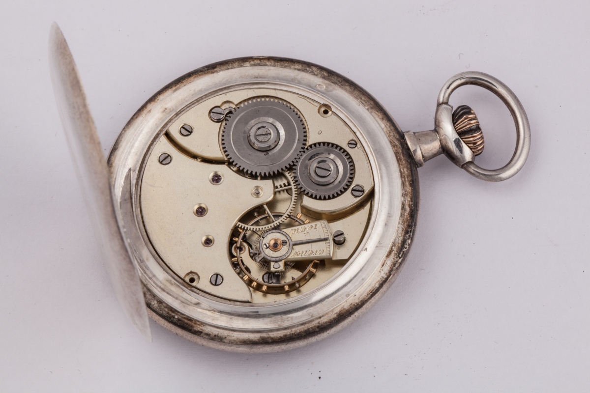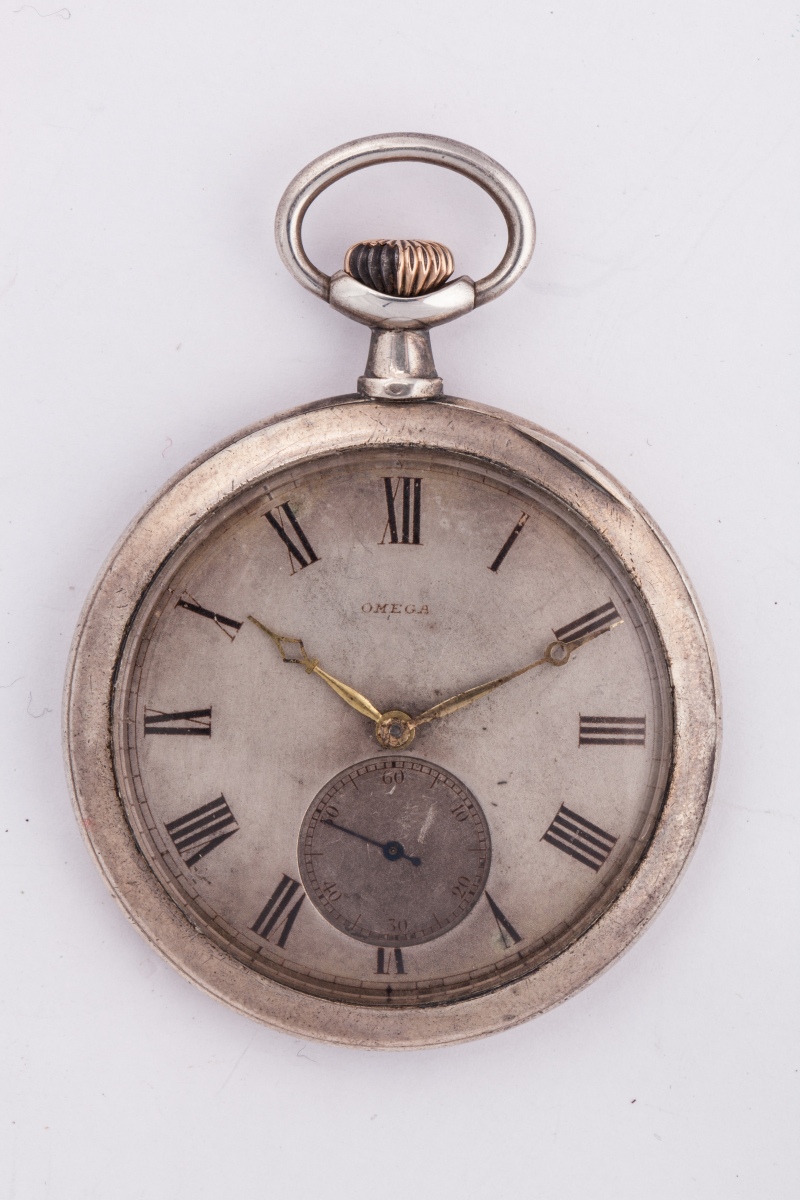 REMONTOIR d'homme dit savonnette, en argent uni. Double cadran. Signe OMÉGA.