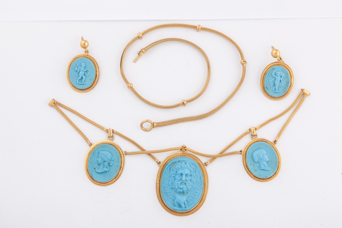 ÉLÉMENTS DE PARURE en métal doré, ornés de camées en verre moulé bleu à l'imitation de la turquoise, comprenant deux parties de collier et une paire de pendants d'oreilles.