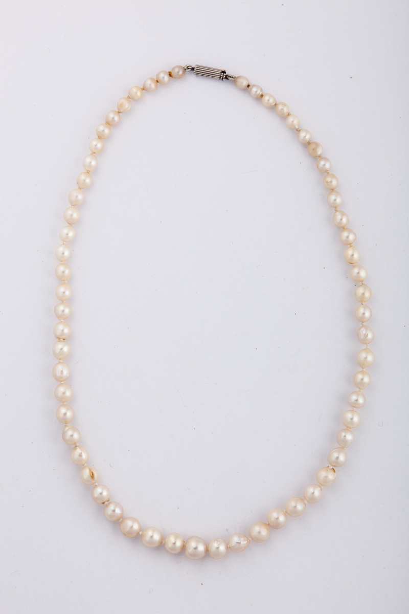 COLLIER de PERLES,  61 perles baroques. Long. 46 cm.