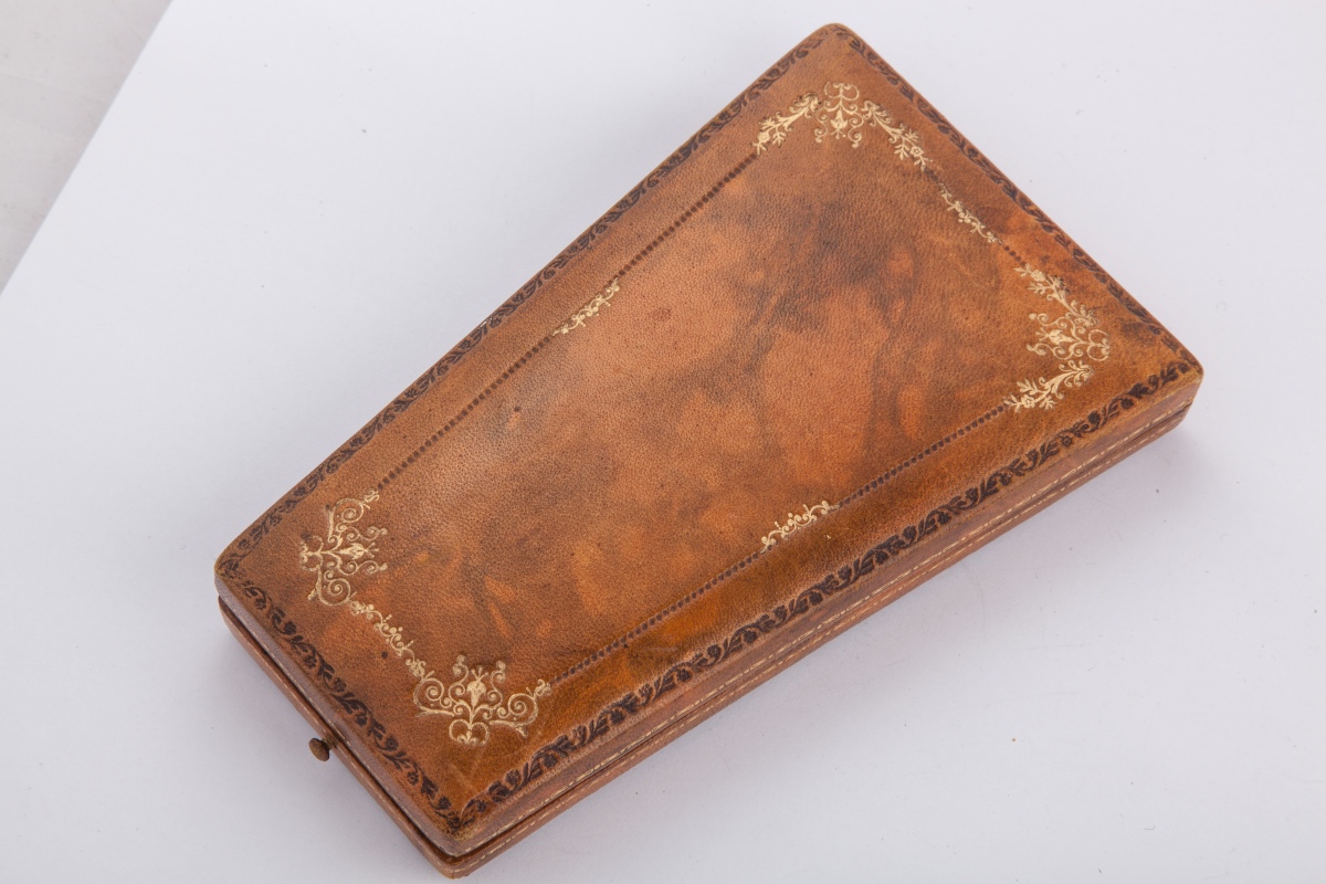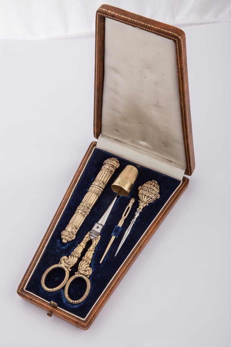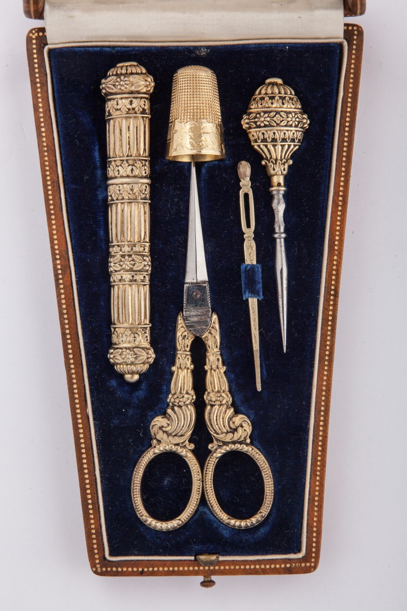 NÉCESSAIRE À COUTURE en vermeil et métal comprenant un étui à aiguilles, une paire de ciseaux, une aiguille à broder et un poinçon. Un DÉ À COUDRE EN OR rapporté. Dans un étui. Travail français de la fin du XIXe, début du XXe.