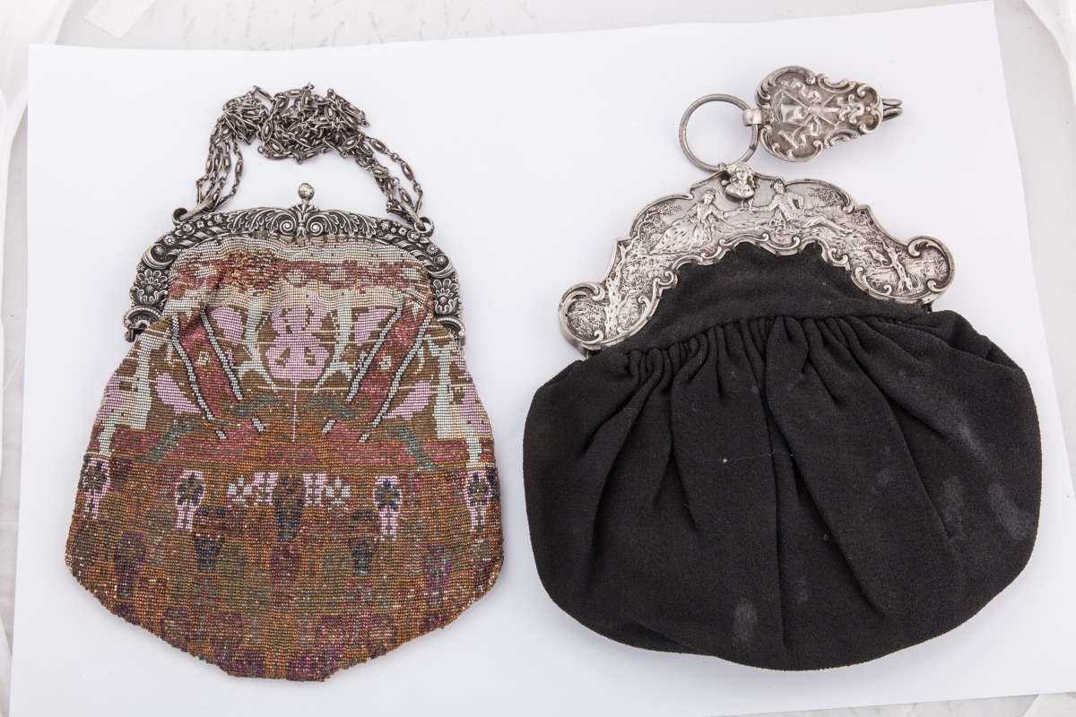 Joint: SAC de SOIRÉE en tissu cotelé noir. Fermoir en argent à motif d'un couple amoureux trinquant au champagne dans un cadre champêtre. Allégorie jardinière en argent. Belle époque. Haut. totale: 32,5 cm.