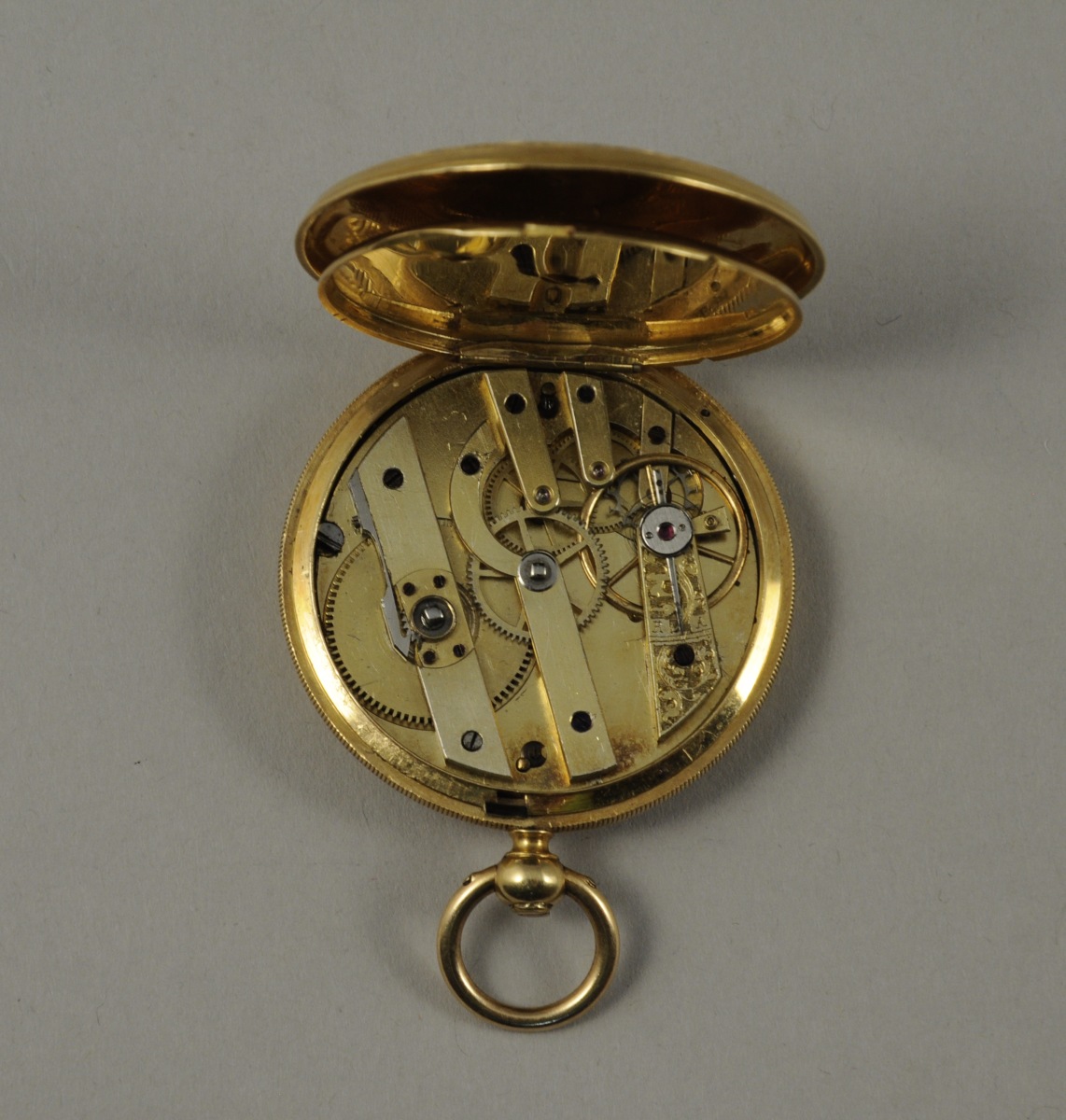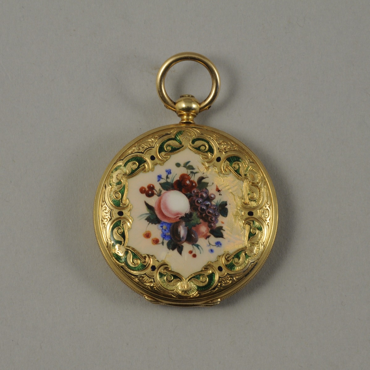 MONTRE de POCHE savonnette en or jaune, pour le marché ottaman, le cadran en chiffres indo-arabes. La boîte est ciselée d'un décor floral sur fond d'émail bleu et vert, figurant sur une face un bouquet de fleur devant un lac, et sur l'autre d'un bouquet de fruits. Remontage à clé. Signée HOURIET n° 23869. Travail suisse, vers 1830. Clé en laiton.