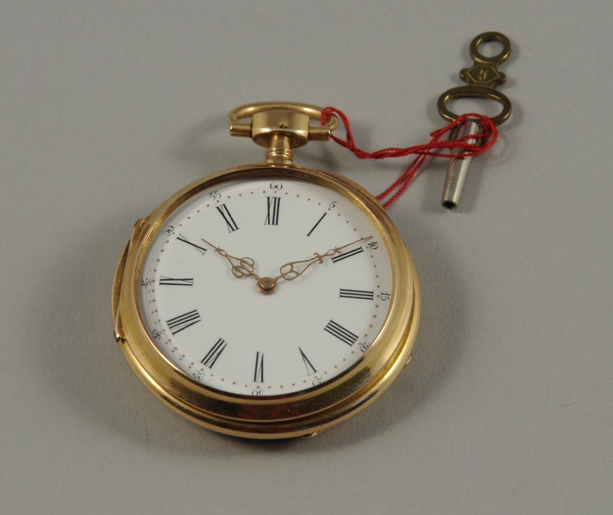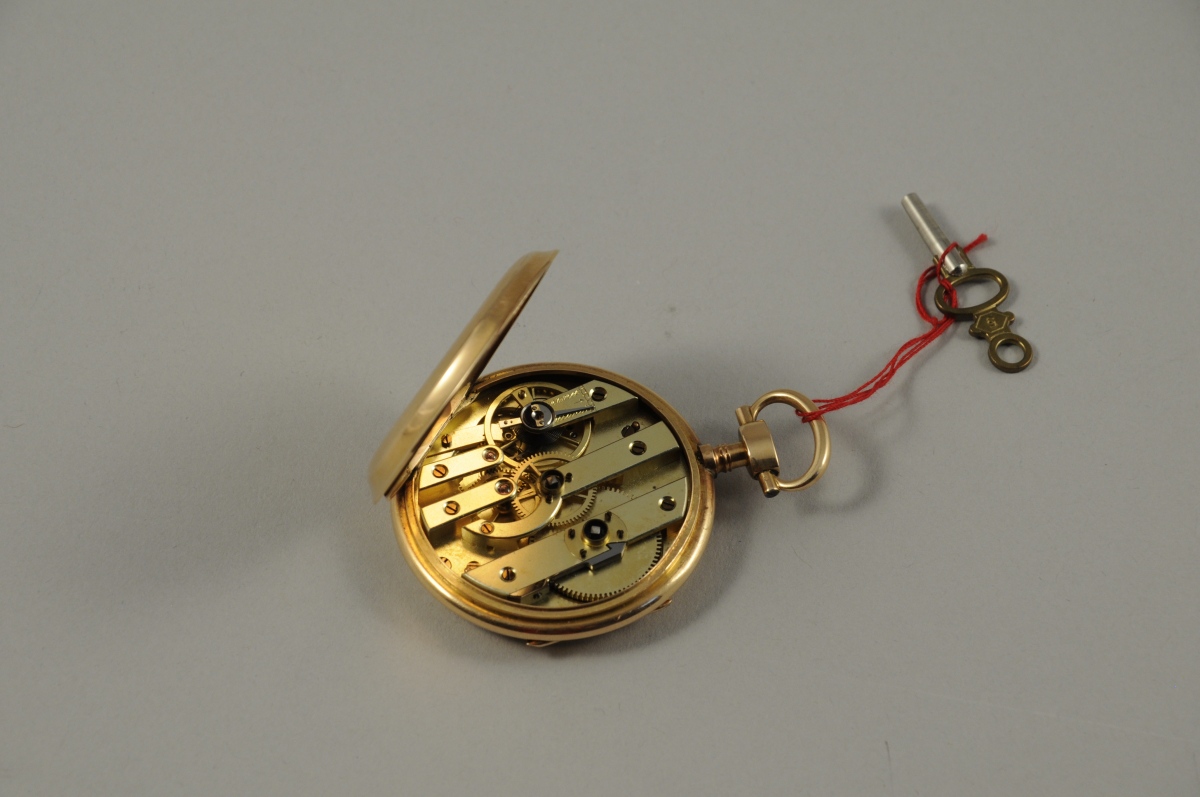 MONTRE de gousset dite " savonnette " en or jaune, le cadran émaillé marqué des hures en chiffres romains, gradué pour les minutes, avec chaque période de cinq minutes en chiffre arabe. Le boitier guilloché, avec un écusson fleuri monogrammé " BS ". Signé " Pierre Meot à Estignac ".