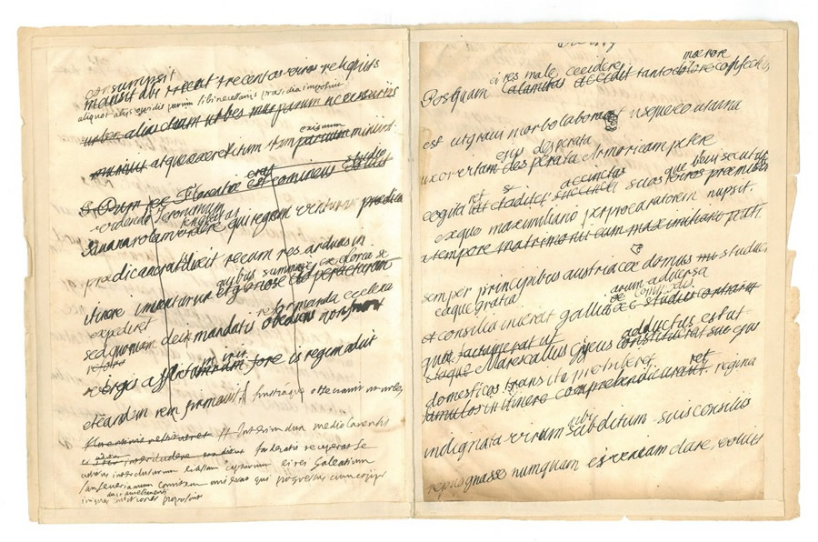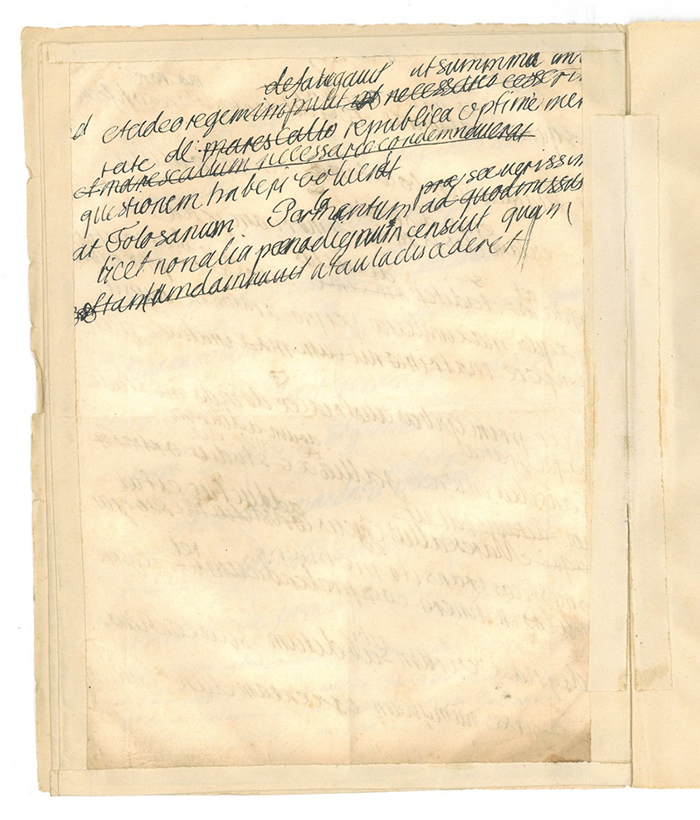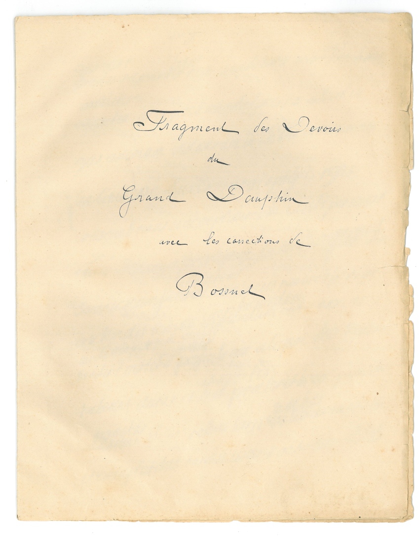 Sur ce devoir, dont le sujet est consacré aux devoirs et charges des rois, très corrigé par le Dauphin sous la direction de son précepteur, Bossuet (qui fut son précepteur de 1670 à 1680) a porté lui-même des corrections autographes ; sur la deuxième page, il a notamment réécrit une ligne, et a biffé tout le bas de la page et ajouté de sa main les six lignes correspondantes.