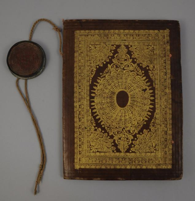 ITALIE. Lettres enluminées de doctorat, Padoue 9 février 1689 ; cahier de 4 ff. de vélin (6 pages) sous reliure veau brun orné d'un riche décor doré, sceau de cire rouge aux armes pendant sur cordelette dans un boîtier métallique (sans le couvercle).