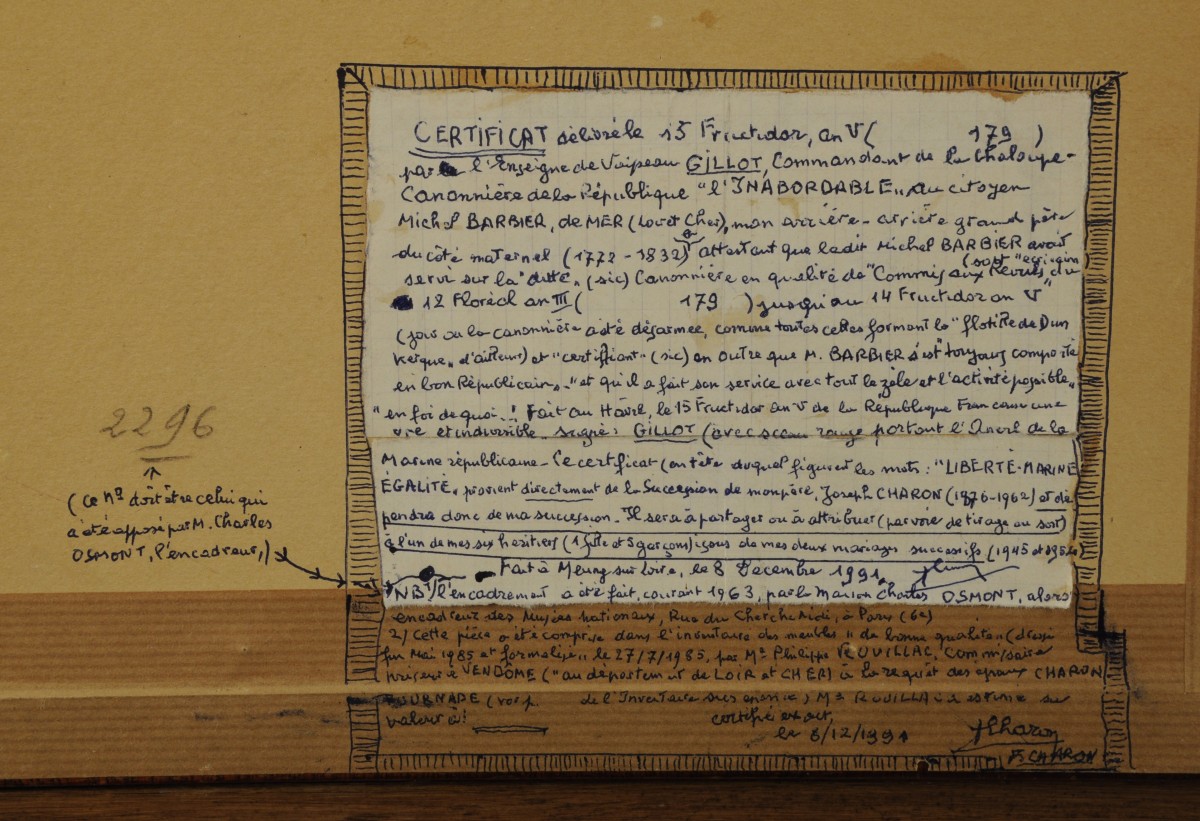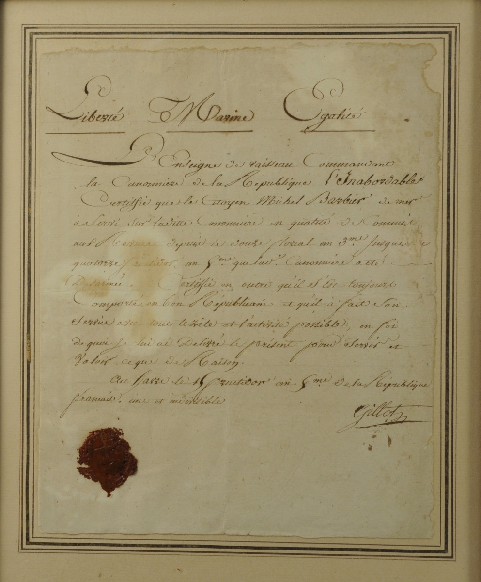 MARINE. CERTIFICAT DE SERVICE du citoyen Michel Barbier de Mer, signé par l'Enseigne Gillot. En-tête "Liberté Marine Égalité". Cachet en bas à gauche. Début XIXème. Dans un cadre en bois.