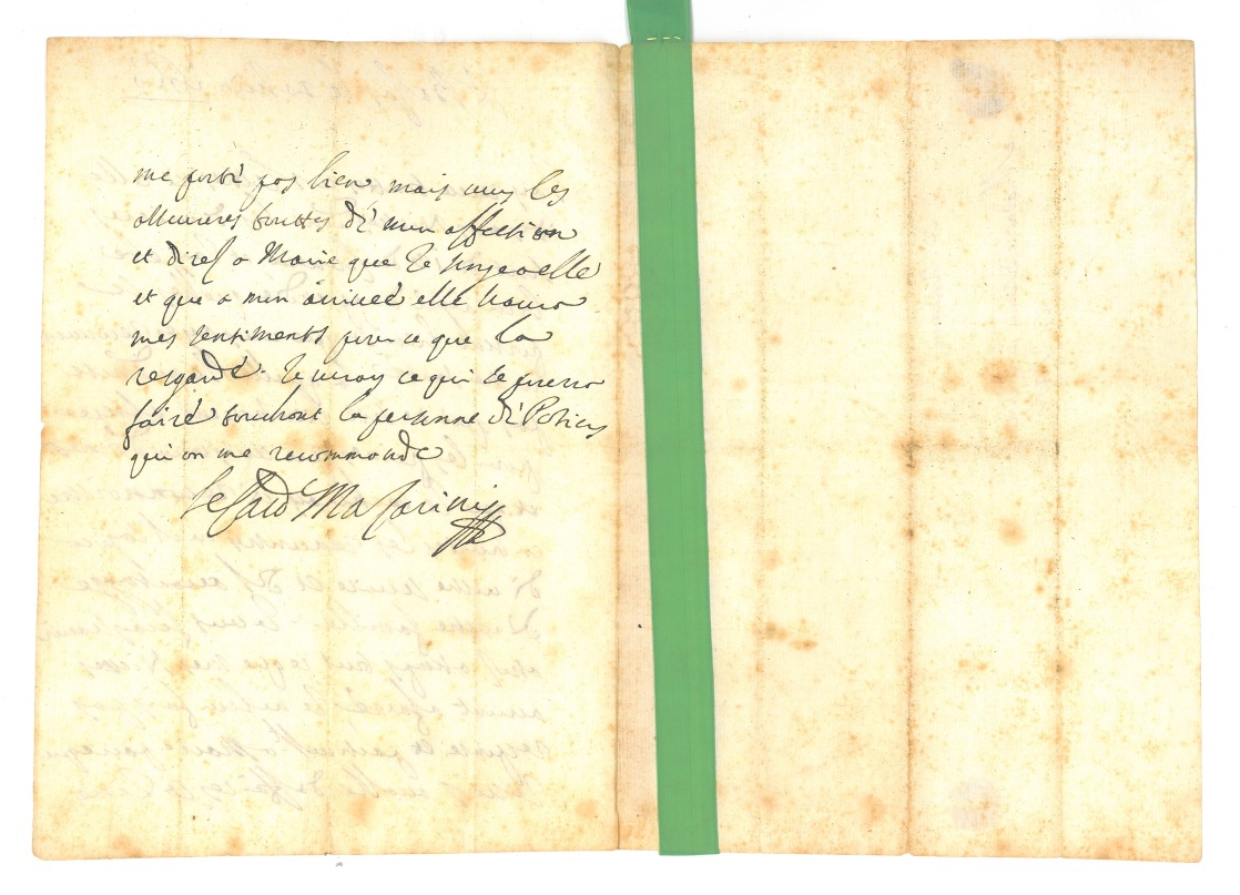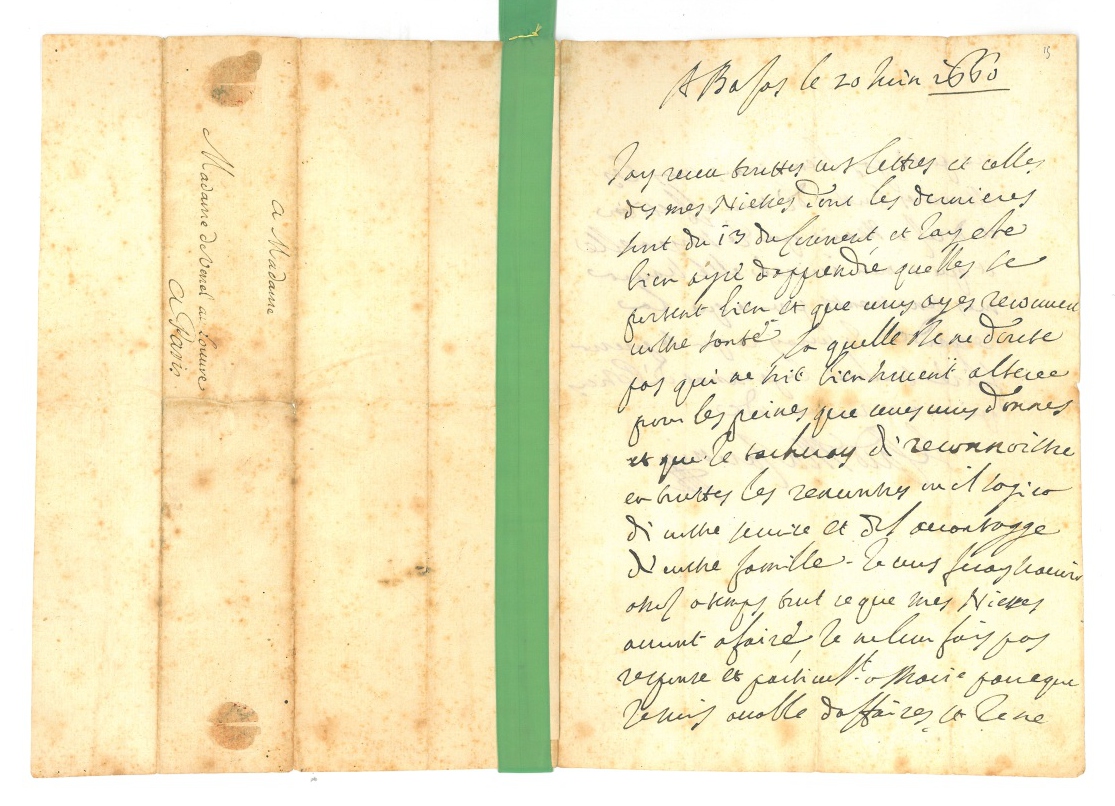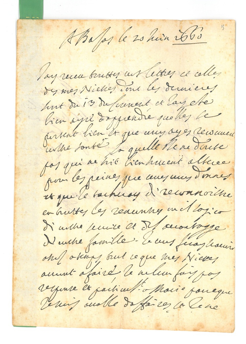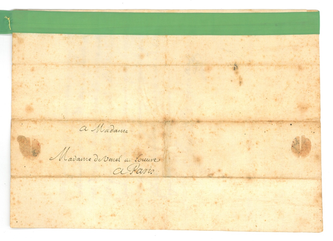 À LA GOUVERNANTE DE SES NIECES. Il a reçu toutes ses lettres et celles de ses nièces: " jay ete bien ayse dapprendre quelles se portent bien et que vous ayez recouvert vostre santé, laquelle je ne doute pas qui ne soit bien souvent alteree par les peines que vous vous donnes et que je tacheray de reconnoistre en touttes les rencontres ou il sagira de vostre service et de lavantagge de vostre famille. Je vous feray scavoir assez a temps tout ce que mes niesses auront a faire, je ne leur fais pas response et particult a Marie parce que je suis accable daffaires et je ne me porte pas bien, mais vous les asseureres touttes de mon affection et dires a Marie que je songe a elle et que a mon arrivée elle scaura mes sentiments pour ce qui la resgarde "