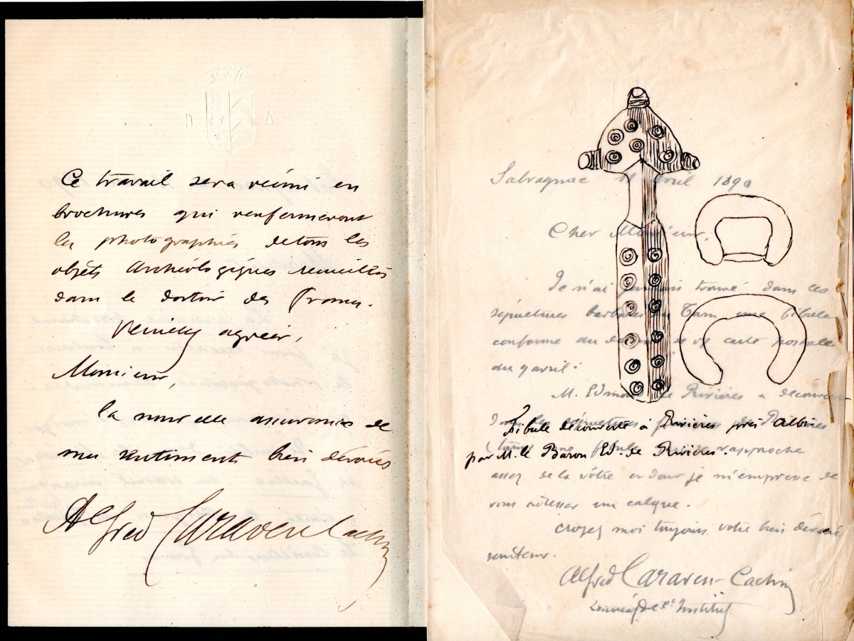 Archéologues, historiens, explorateurs: 5 L.A.S. Casimir BARRIERE-FLAVY ; L.A.S. Alberto BLEST GANA (écrivain chilien) ; L.A.S. Joseph Louis CAPITAN (anthropologue) ; 4 L.A.S. dont croquis Alfred CARAVEN-CACHIN (préhistorien) ; L.A.S. dont croquis Emile CARTAILHAC (préhistorien) ; L.A.S. William Martin CONWAY (Cambridge) ; L.A.S. révérend Edward CONYBEARE (vicaire de Barrington, Cambridge) ; L.A.S. Henri COROT (archéologue) ; 2 L.A.S. Léopold DELILLE (administrateur général de la bibliothèque nationale) ; 4 L.A.S. Maximin DELOCHE ; 7 L.A.S. Arthur John EVANS (Oxford) ; Fidel FITA (archéologue espagnol) ; L.A.S. Enrico GIGLIOLI (anthropologue) ; 2 L.A.S. Alphonse GOSSET (architecte) ; L.A.S. Jean HESS (explorateur) ; 4 L.A.S. révérend S.S. LEWIS (Corpus Christi collège de Cambridge) ; L.A.S. Jacques de MORGAN (égyptologue) ; 3 L.A.S. Jean François du POUGET de NADAILLAC (anthropologue) ; Alphonse PINART (archéologue) ; L.A.S. Charles Henri SCHEFER, 5 L.A.S. P.TOUSSAINT ; L.A.S. René VERDEAU (anthropologue).