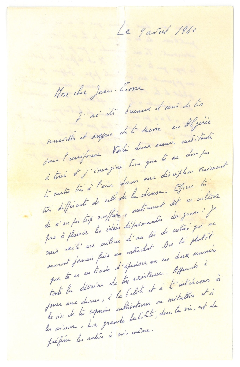 Marcel AYMÉ. L.A.S. 2 pages du 9 avril 1960 à Jean-Pierre Lagrue, danseur conscrit en Algérie.: "Voilà deux années embêtantes à tenir et j'imagine bien que tu ne dois pas sentir très à l'aise dans une discpline vraiment très différente de celle de la danse. Efforce toi de n'en pas trop souffrir (...) Dis toi plutôt que tu es en train d'épuiser en ces deux années toute la déveine de ton existence. Apprends à jouer aux dames, à la belote et à t'intéresser à la vie de tes copains cultivateurs ou métallos et à les aimer. La grande habilité, dans la vie, est de préférer les autres à soi-même."