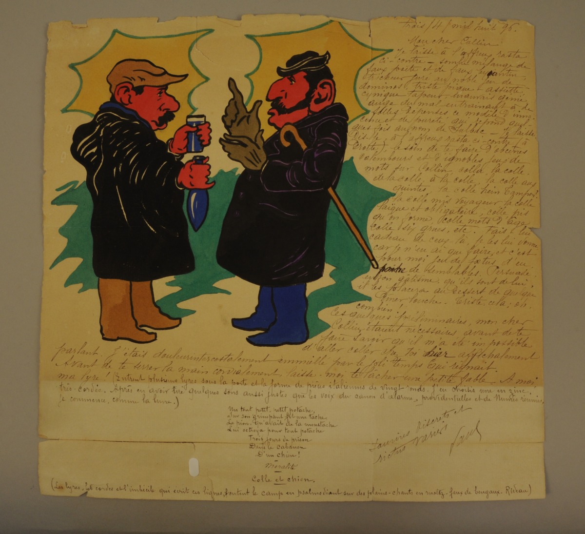 - LETTRE manuscrite comprenant de nombreux jeux de mots accompagnée d'un dessin humoristique en couleurs. Destinée à Lucien Collin, signée "Paul" et datée "trois/4/mil huit 96". 30,5 x 32 cm. (déchirures)