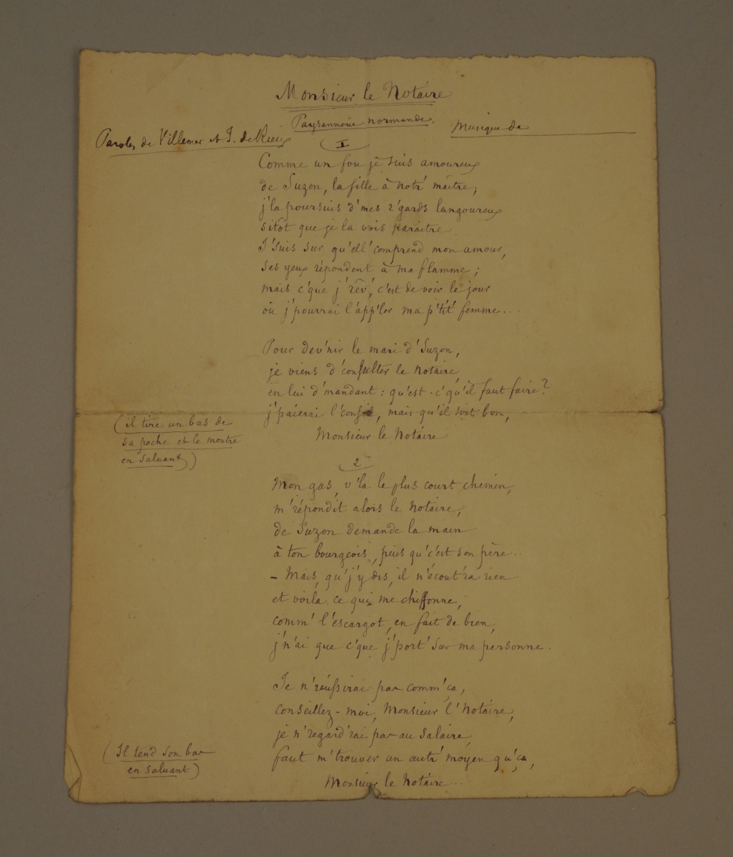 - 10 PARTITIONS et paroles de chansons: "La patronne est une femm' d'esprit", "La Glace parlante", "Monsieur le notaire", "Monsieur Lapin", "La première fois", "Le Dictionnaire", "Rions, buvons et moquons-nous du reste", "Une ménagerie dans un pupitre", "Lachez-moi le coude", "Nouvelle chanson".Vers 1900. 31 x 23 cm. (usures)