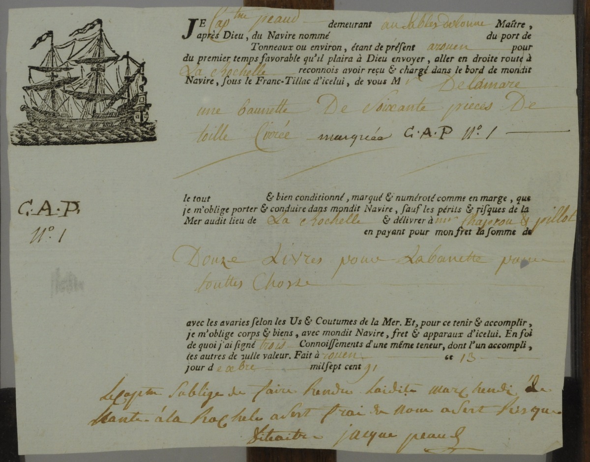 RÉUNION de bons de réception et de quittances. Certains provenant d'Orléans, Limoges, La Rochelle. Dans 16 cadres en bois de loupe. XVIIIème.