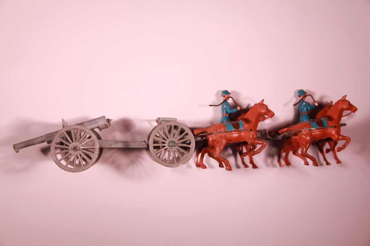 France. 11 figurines: 1 cavalier cheval noir, 2 cavaliers cheval marron, 1 véhicule hippomobile tiré par 4 chevaux avec 2 cavaliers, 1 canon de 75. Epoque: 1ère Guerre Mondiale.