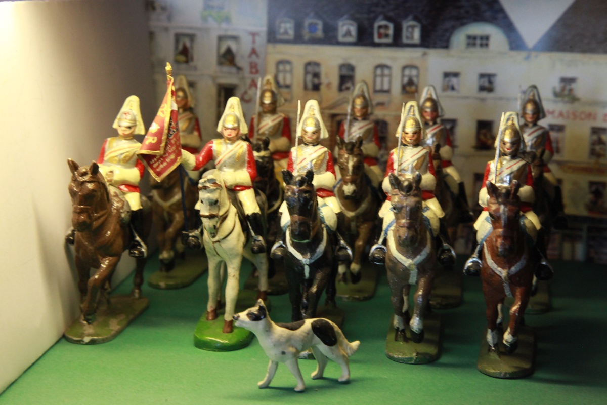 Grande-Bretagne. 11 figurines de Life Guards: 10 cavaliers, 1 chien. Epoque: Trooping the Colour.