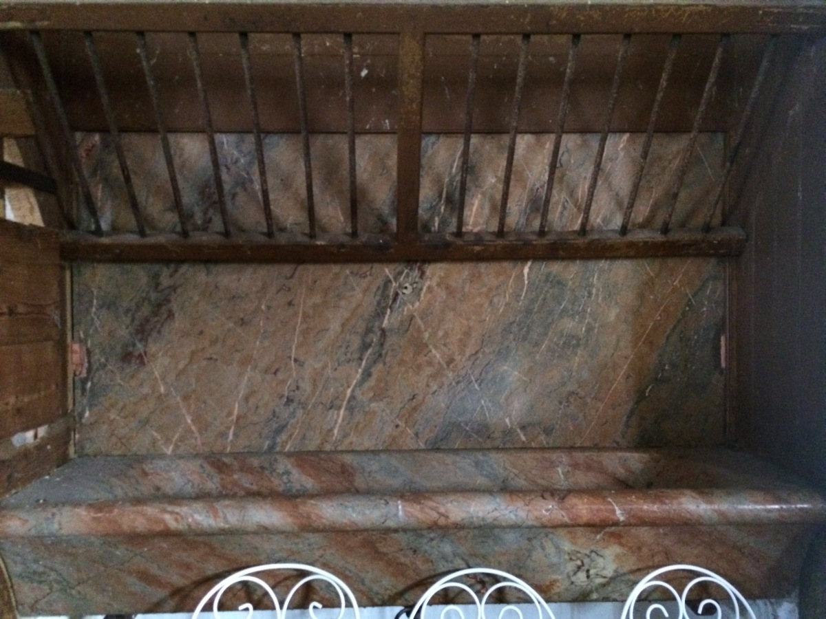 surplombées de SIX PLAQUES, en marbre Brocatelle orangé.