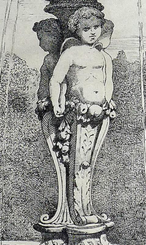 FONTAINE aux AMOURS en fonte de fer et de cuivre. Un groupe de trois amours en cuivre patiné, chacun doté de sa personnalité, se tient la main relié par des guirlandes fleuries. Les amours sont adossés en gaine, terminée par des enroulements feuillagés, à une colonne cannelée, richement ornée et sommée d'un tore de laurier. Les amours supportent un grand bassin circulaire en fonte de fer ; ils reposent sur un piédouche en doucine de forme circulaire, lui-même posé sur une console de forme quadrangulaire.