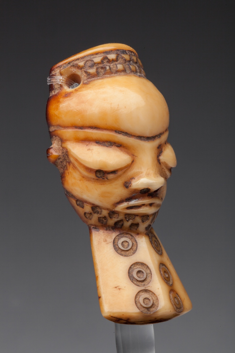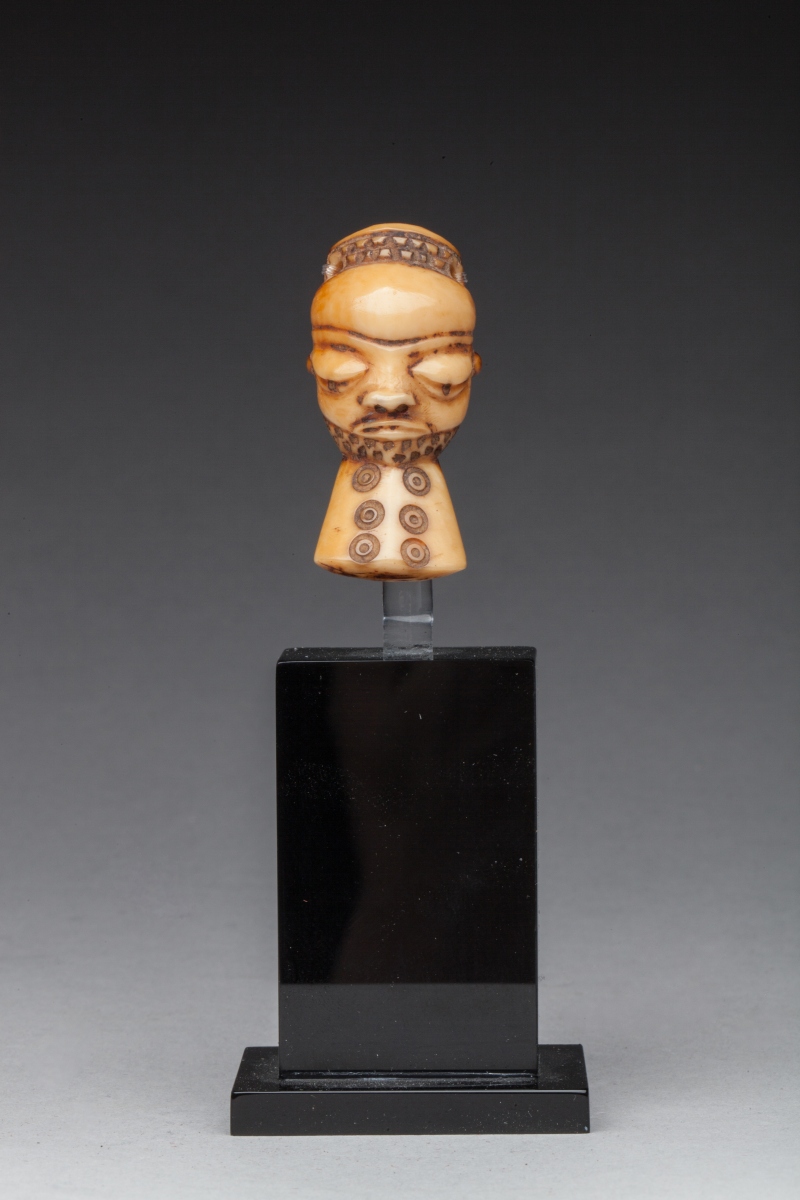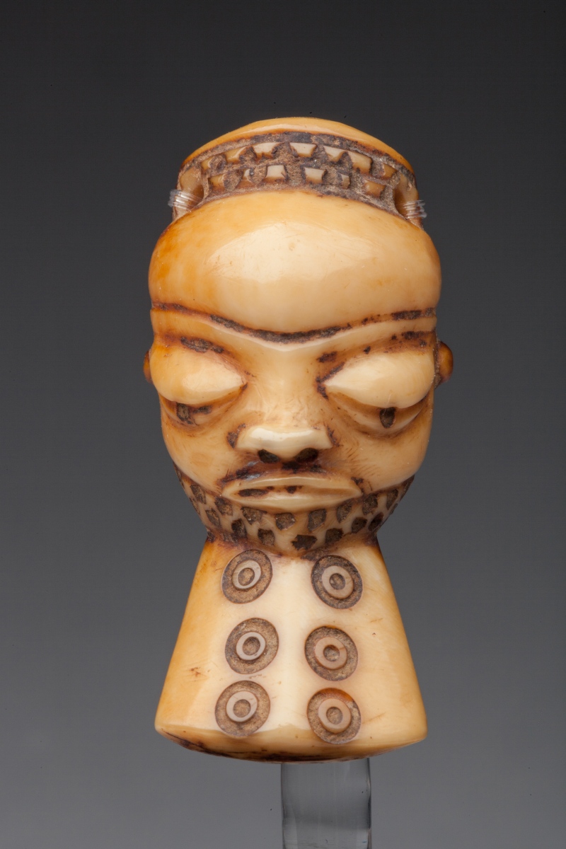 Pendentif "IKHOKO" en ivoire à patine blonde orangée, représentant le masque "Muyombo" à barbe décorée de cercles-points, deux trous de suspension.