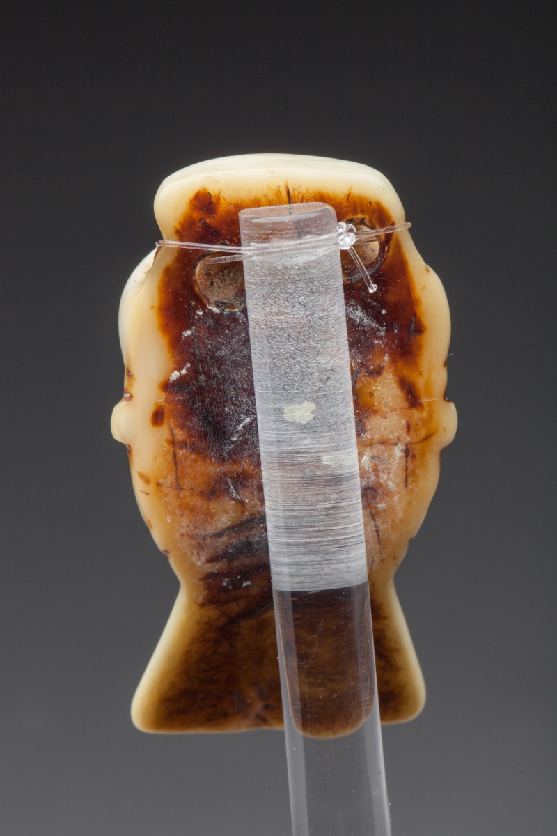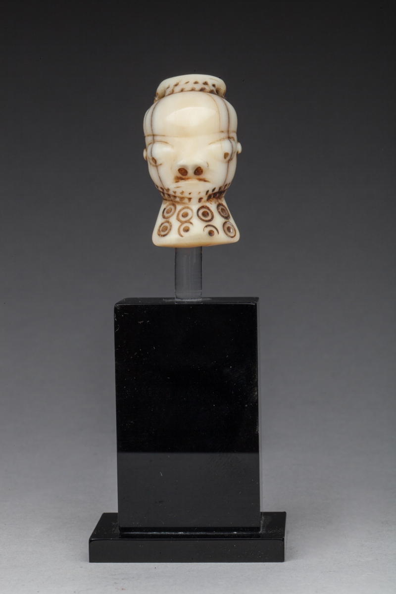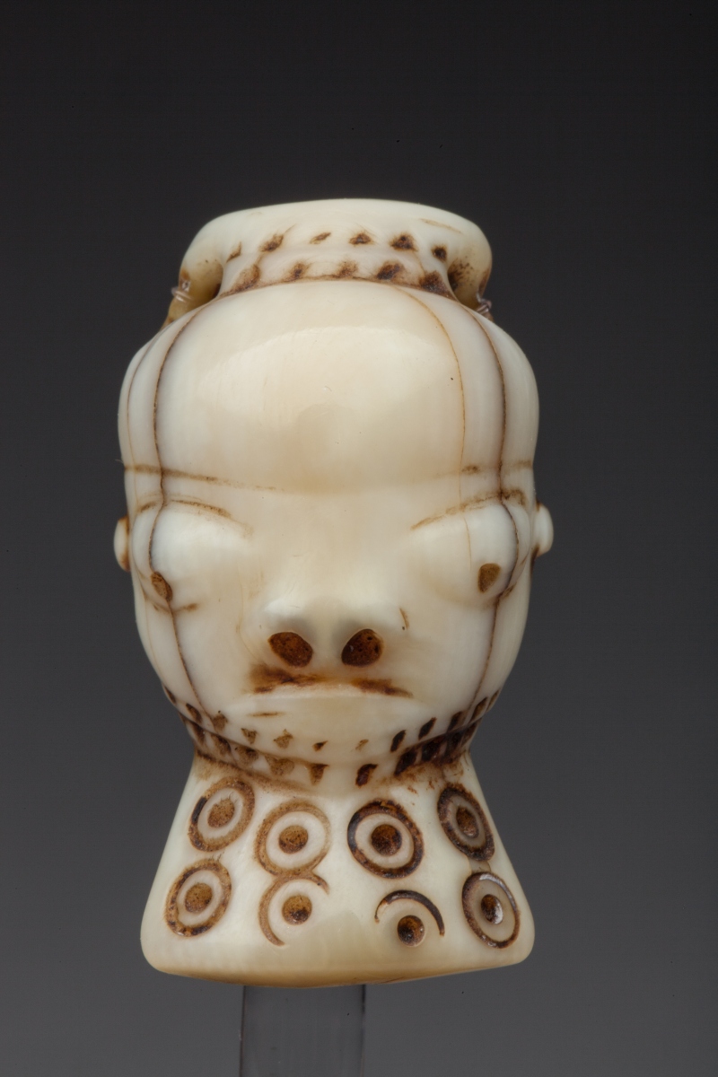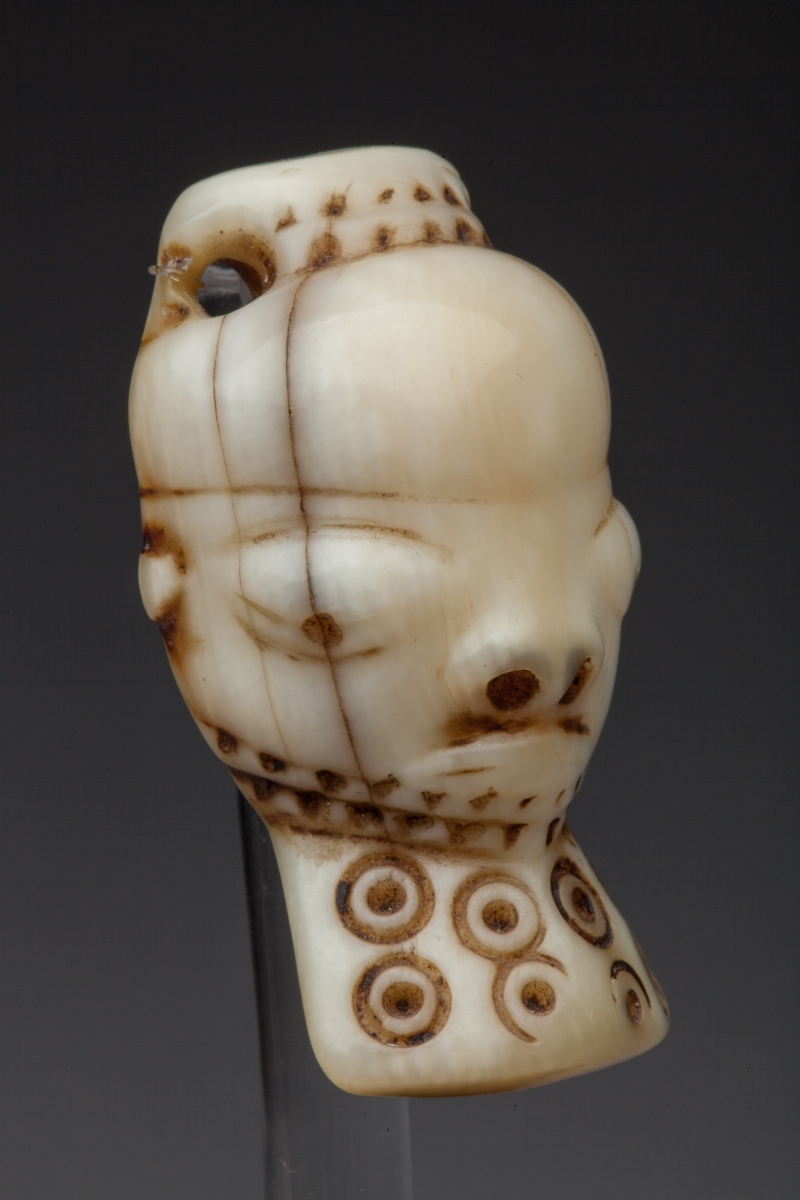 "IKHOKO" en ivoire à patine blonde, représentant le masque "Muyombo" à barbe décorée de cercles-points, deux trous de suspension.