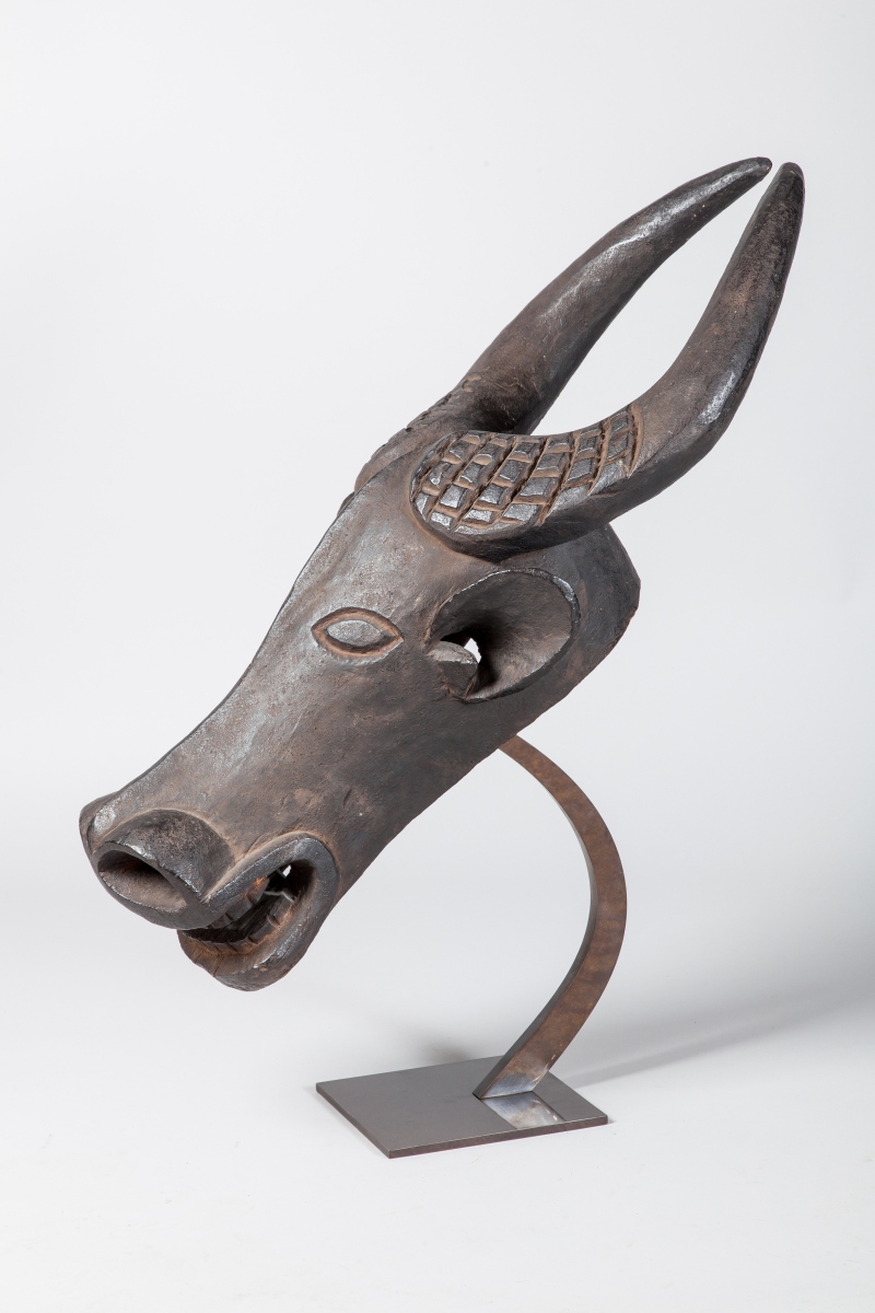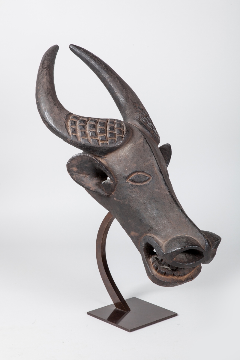 Masque représentant un buffle, rare dans la population Bamiléké, plus commun dans la région des grasslands, plus à l'ouest. Il appartient à la société "Ku'n'gau", réservée aux notables représentant le Fon.