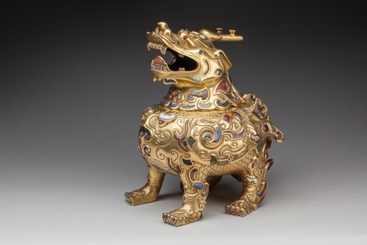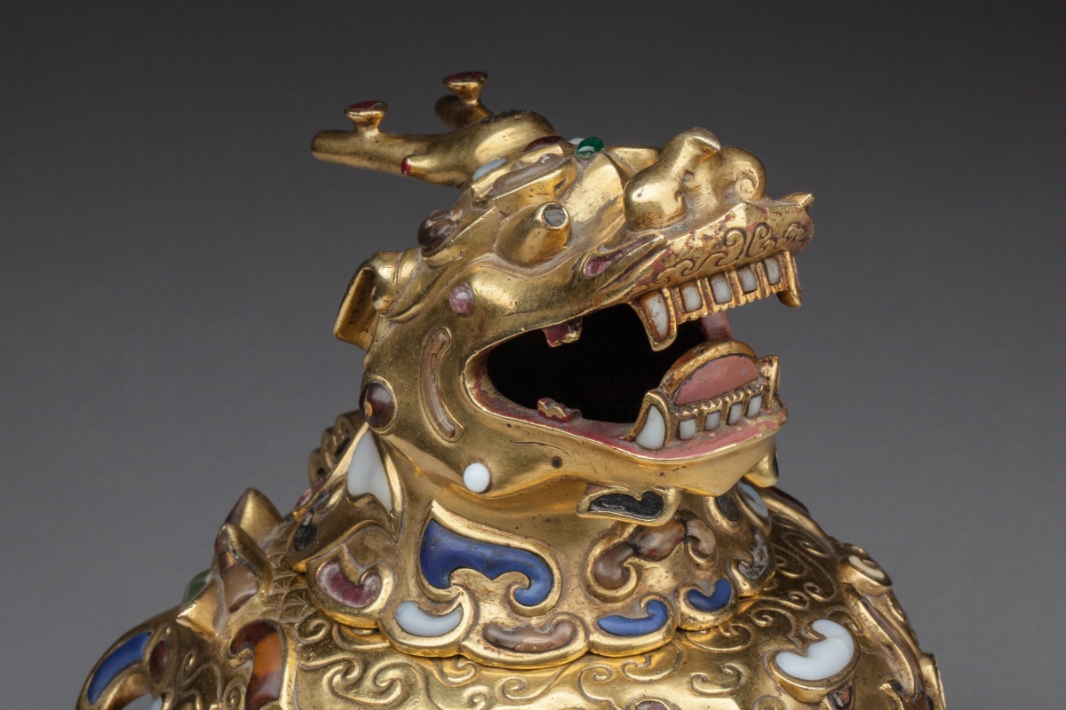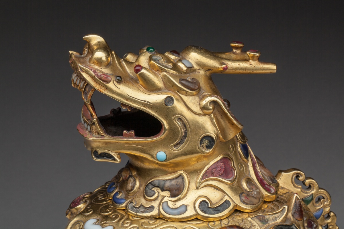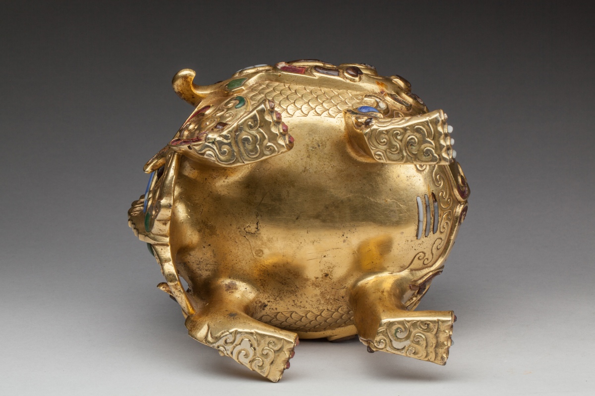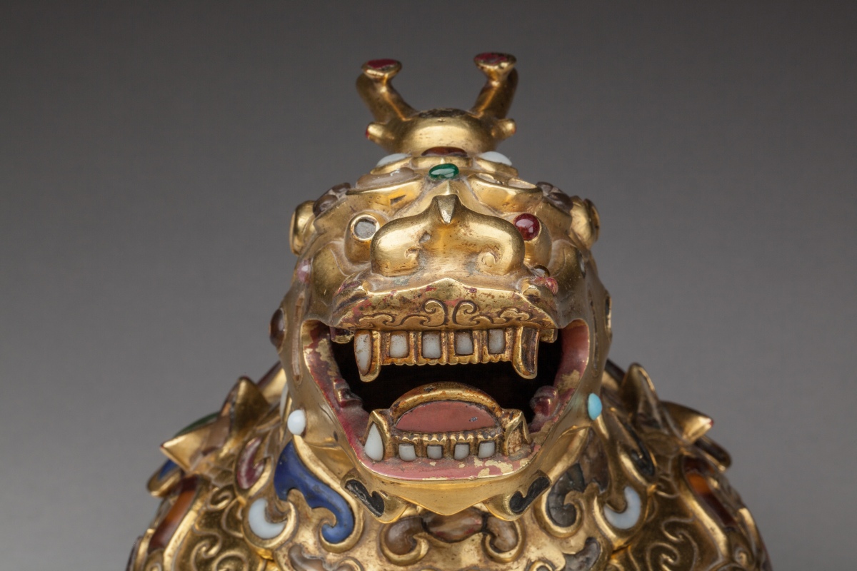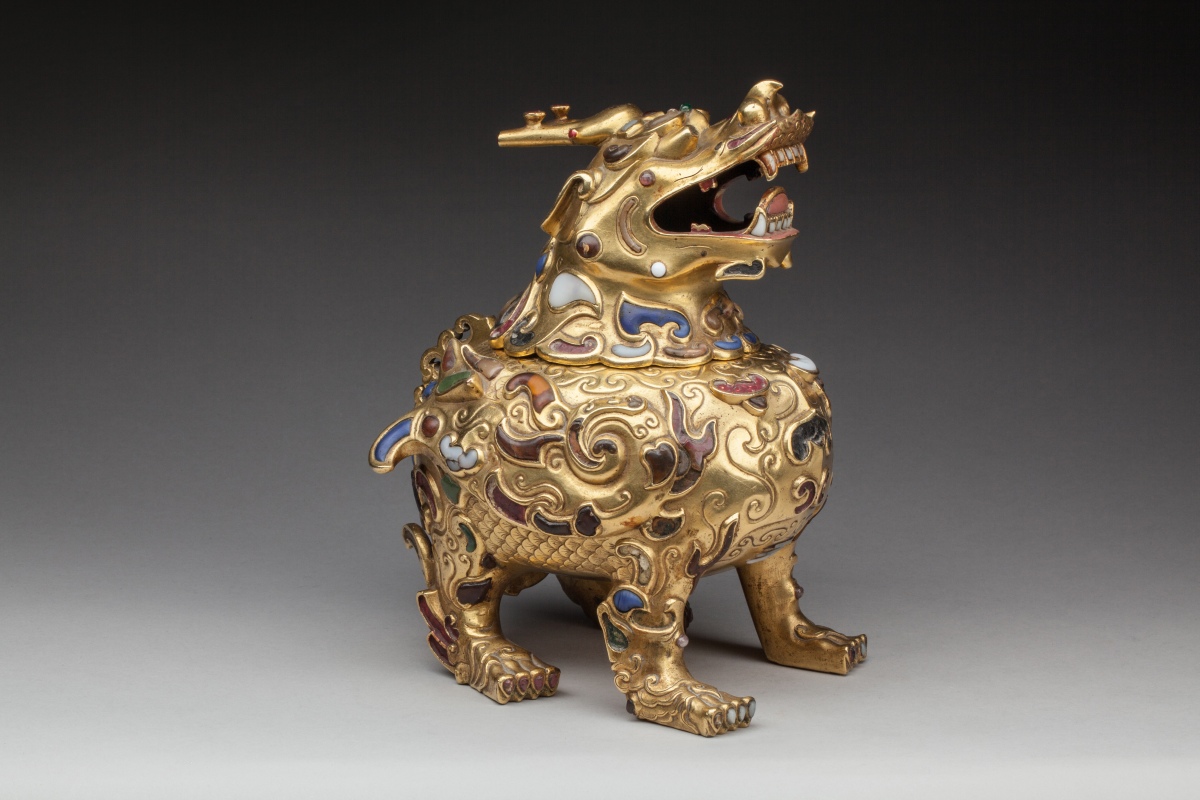BRULE PARFUM À LA CHIMÈRE en bronze doré, en forme d'animal fantastique, fermement campée sur ses quatre pattes, le corps trapu rehaussé d'écailles, les flancs pourvus d'ailes, la queue terminée par deux volutes de part et d'autre d'une arête dorsale proéminente, la gueule ouverte laissant apparaître des crocs, le museau pointu, les yeux exorbités, les cornes dressées. L'ensemble du corps, les crocs et les griffes rehaussés de pierres, notamment agate, et de cabochons de pâte de verre de couleurs de formes et de tailles diverses.