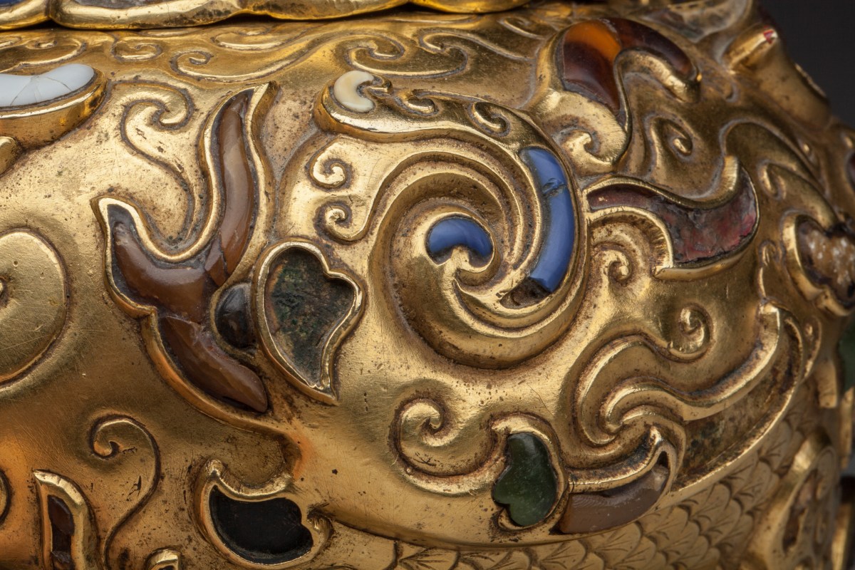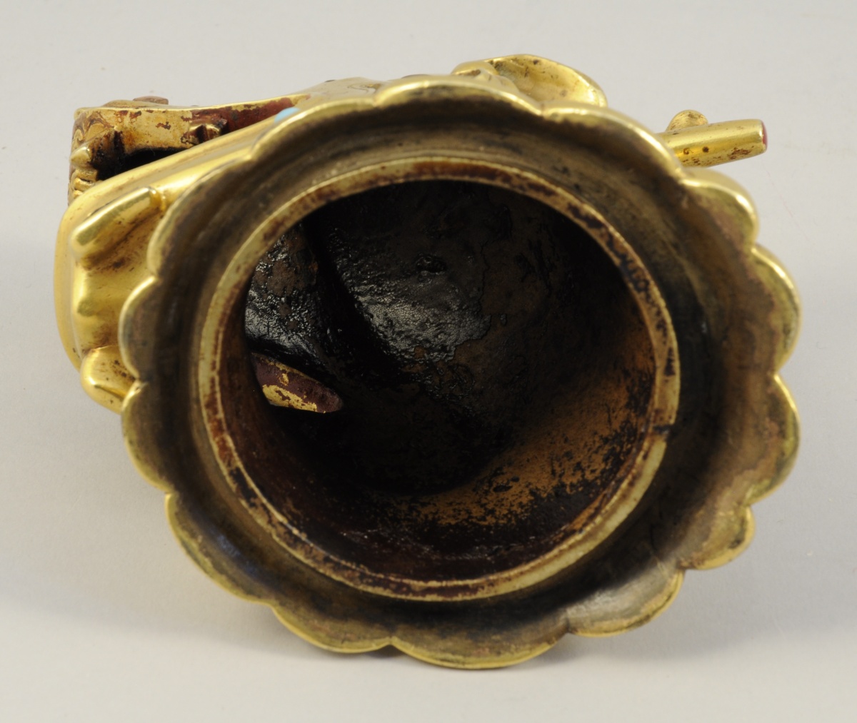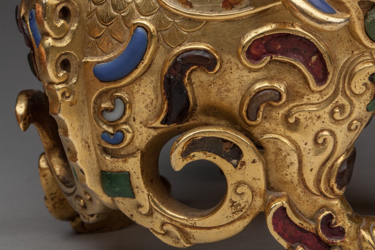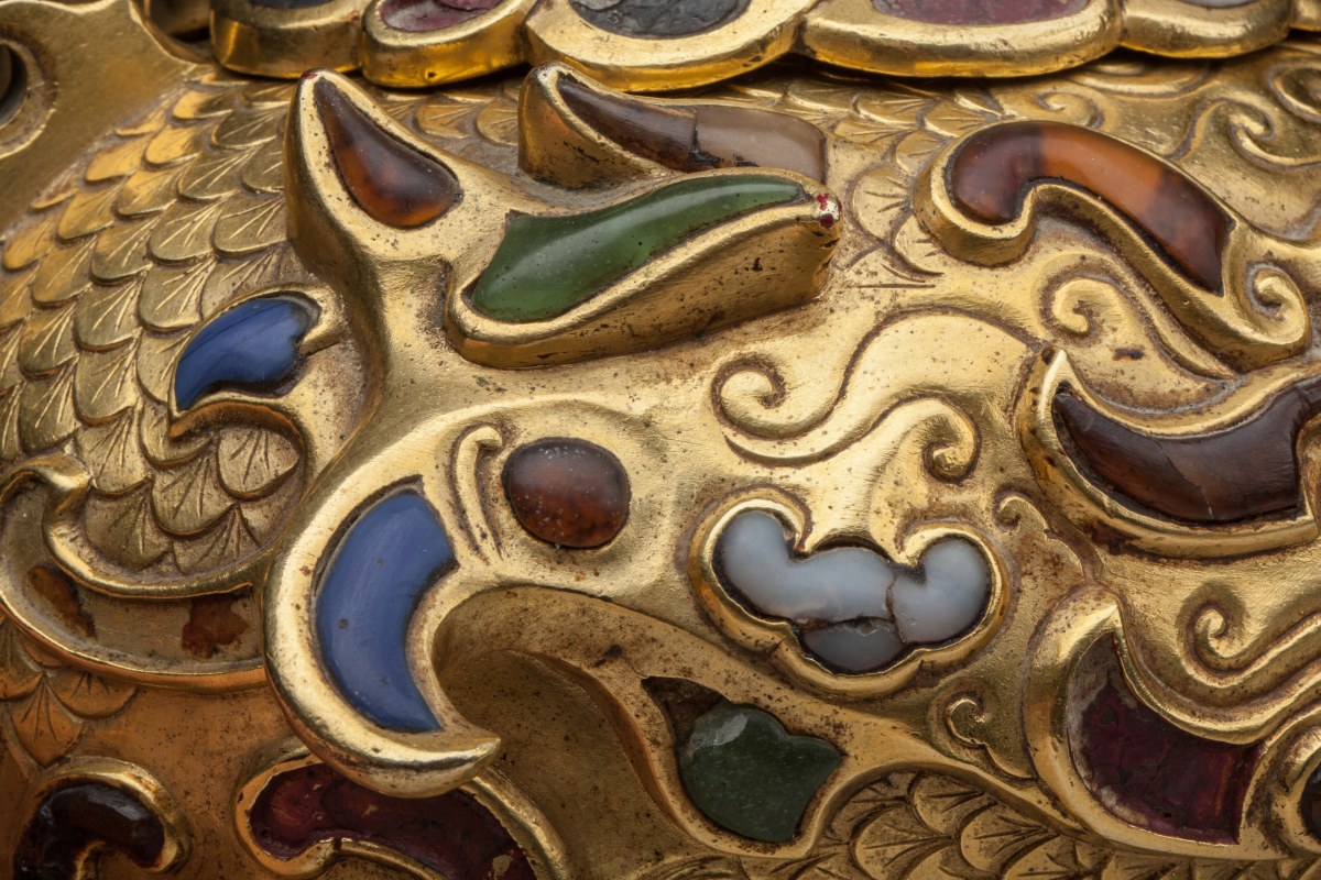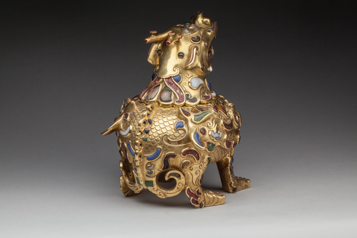 BRULE PARFUM À LA CHIMÈRE en bronze doré, en forme d'animal fantastique, fermement campée sur ses quatre pattes, le corps trapu rehaussé d'écailles, les flancs pourvus d'ailes, la queue terminée par deux volutes de part et d'autre d'une arête dorsale proéminente, la gueule ouverte laissant apparaître des crocs, le museau pointu, les yeux exorbités, les cornes dressées. L'ensemble du corps, les crocs et les griffes rehaussés de pierres, notamment agate, et de cabochons de pâte de verre de couleurs de formes et de tailles diverses.