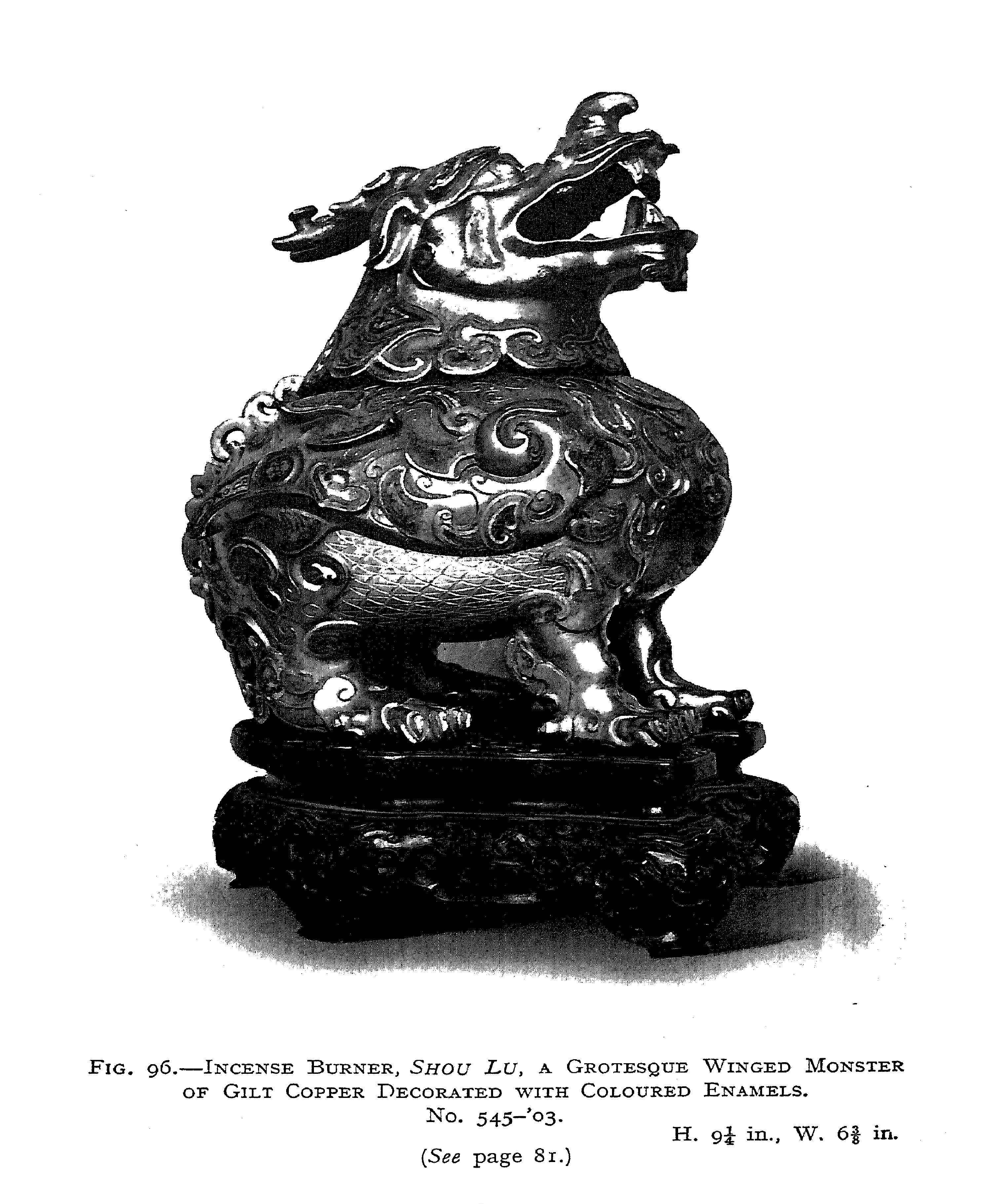- Stephen W. Bushell, "Chinese Art II", Londres, 1919. Un brûle parfum proche, avec des marques Qianlong, d'une paire conservée au Victoria and Albert Museum reproduit sous le n°96, p.79 et décrit p. 81.
