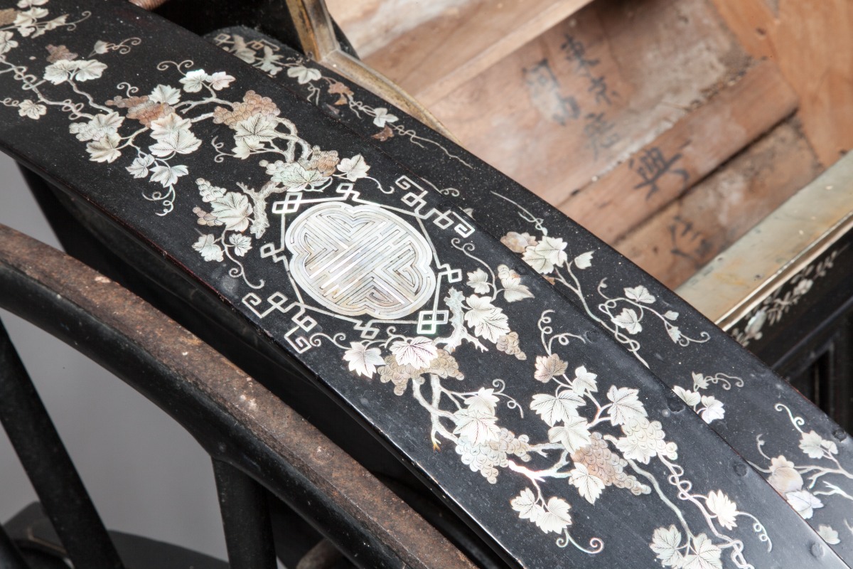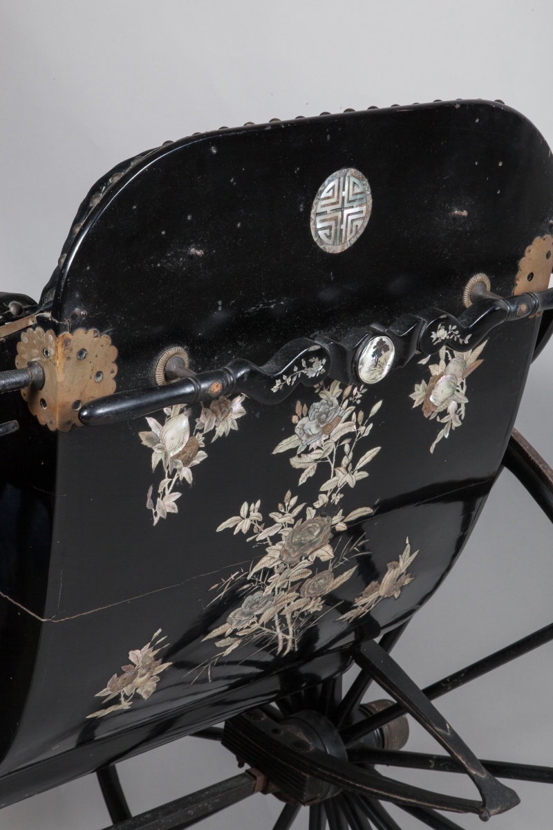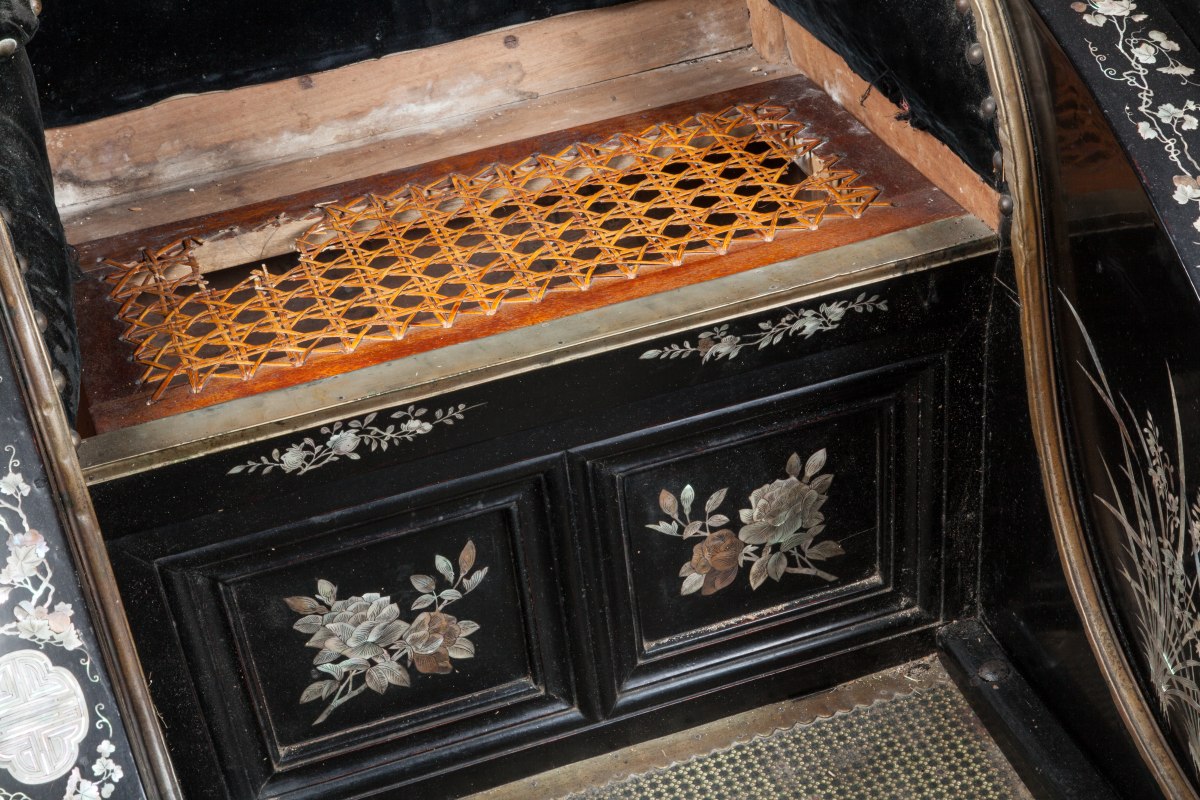 Bois dur du Tonkin laqué noir avec incrustations de nacre. Décors de bouquets fleuris de roses, guirlandes de vigne, branchages et paysage. Commande de l'Empereur Than-Thaï aux artisans du village de Kin-Luoc à Hanoï, pour l'usage privé de sa mère, dans les jardins impériaux.