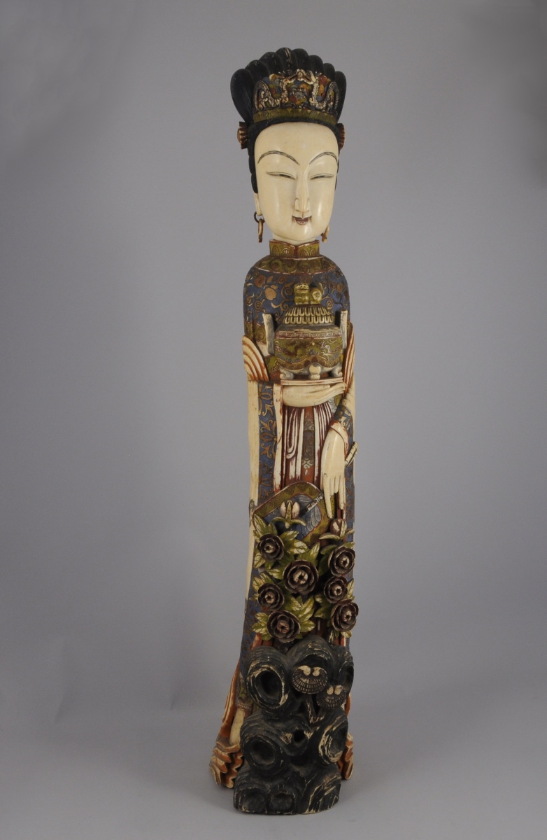 PERSONNAGE AU BRÛLE PARFUM. Défense d'éléphant en ivoire polychrome sculpté...