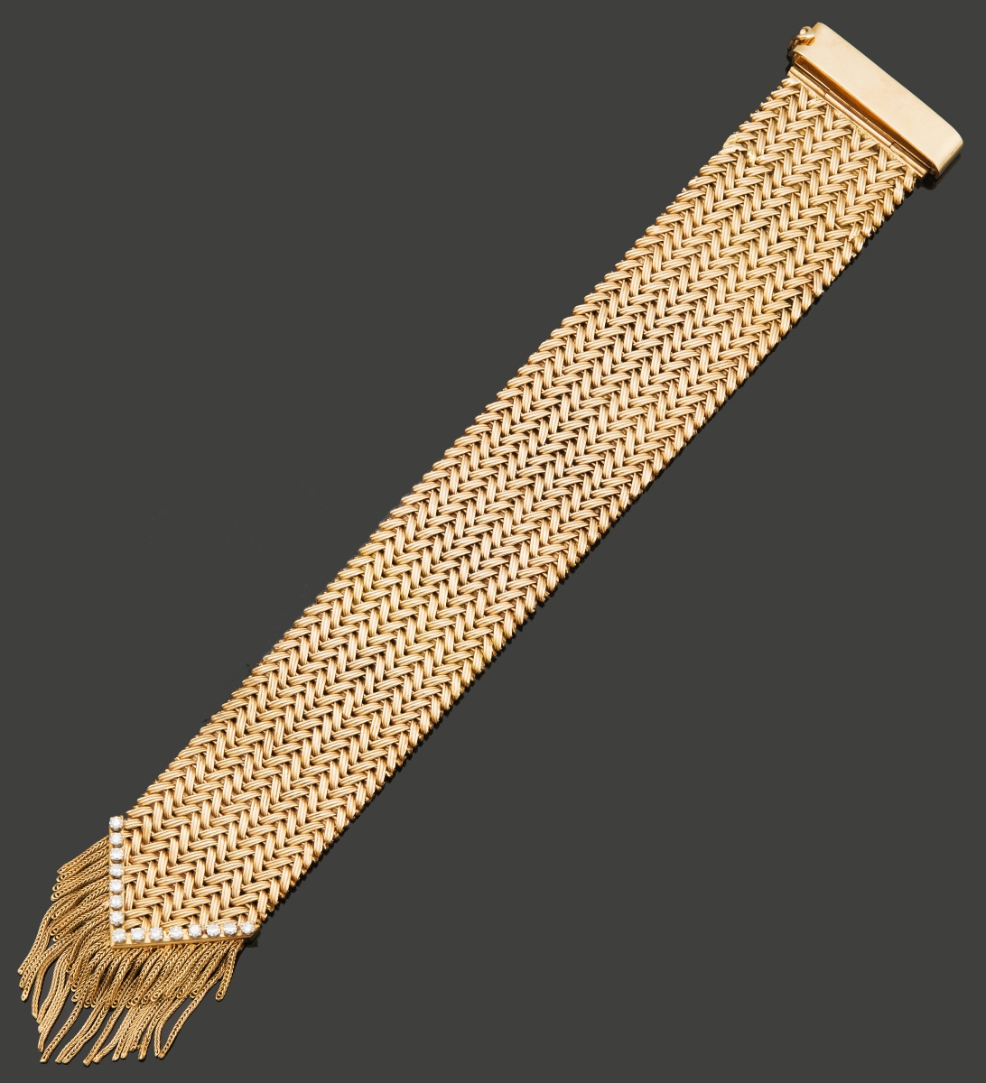 Large BRACELET ceinture souple, en or jaune 18K, l'extrémité ornée de deux lignes de diamants ronds taillés en huit-huit et de brins d'or en pampille.